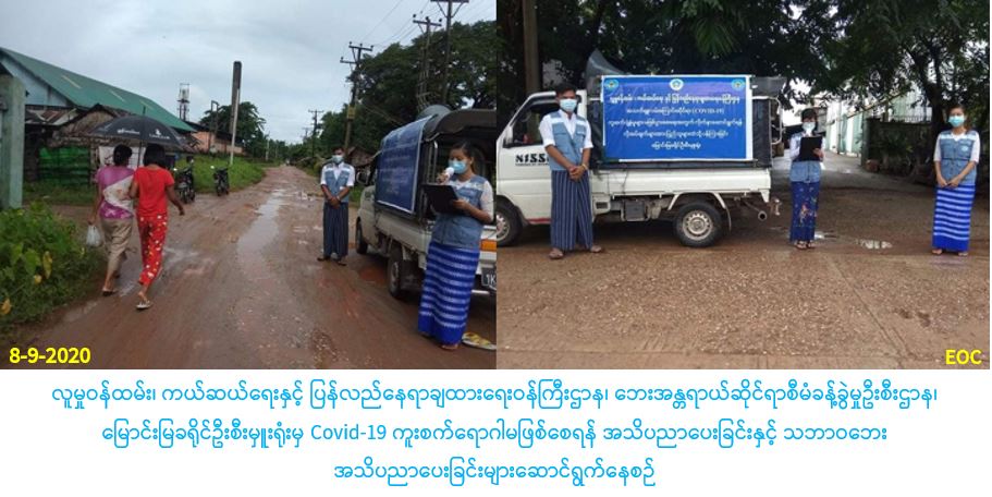 လူမှုဝန်ထမ်း၊ ကယ်ဆယ်ရေးနှင့် ပြန်လည်နေရာချထားရေးဝန်ကြီးဌာန၊ ဘေးအန္တရာယ်ဆိုင်ရာစီမံခန့်ခွဲမှုဦးစီးဌာန၊ မြောင်းမြခရိုင်ဦးစီးမှူးရုံးမှ တာဝန်ရှိသူများသည် (၈-၉-၂၀၂၀) ရက်နေ့ ၊ နေ့လယ် (၁၅းဝဝ) နာရီအချိန်မှ ညနေ (၁၈းဝဝ) နာရီ အချိန်အထိ မြောင်းမြခရိုင်၊ မြောင်းမြမြို့နယ်အတွင်းရှိ အမှတ်(၁)ရပ်ကွက်၊ အမှတ်(၂)ရပ်ကွက်၊ အမှတ်(၃)ရပ်ကွက်၊ အမှတ်(၄)ရပ်ကွက်၊ အမှတ်(၅)ရပ်ကွက်၊ အမှတ်(၆)ရပ်ကွက်၊ အမှတ်(၇)ရပ်ကွက်၊ အမှတ်(၈)ရပ်ကွက်၊ အမှတ်(၉)ရပ်ကွက်၊ အမှတ်(၁၀)ရပ်ကွက်၊ မရမ်းကုန်းရပ်ကွက်၊ ကံ့ကော်မြိုင်ရပ်ကွက်၊ မြရတနာရပ်ကွက်၊ မြကန်သာရပ်ကွက်၊ မြဟေမာရပ်ကွက်၊ မြစန္ဒာရပ်ကွက်တို့တွင် ကျန်းမာရေးနှင့်အားကစားဝန်ကြီးဌာနမှ ထုတ်ပြန်ထားသော COVID-19 ထိန်းချုပ်ရေးနှင့် အရေးပေါ်တုံ့ပြန်ရေးကော်မတီမှ ထုတ်ပြန်ပြီးဖြစ်သည့် တားမြစ်မိန့်နှင့် ညွှန်ကြားချက်များအားလည်းကောင်း၊ မိုးရာသီတွင် ဖြစ်ပွားလေ့ရှိသည့် ရေဘေး၊ မုန်တိုင်းဘေးနှင့် မိုးကြိုးဘေးစသည့် သဘာဝဘေးအသိပညာပေးဆောင်ရွက်ခြင်းများအား အများပြည်သူများသိရှိလိုက်နာရန် ကွင်းဆင်းလှည့်လည်၍ အသိပညာပေးခြင်းလုပ်ငန်းများ ပြုလုပ်ဆောင်ရွက်ခဲ့ပါကြောင်း သတင်းရရှိပါသည်။