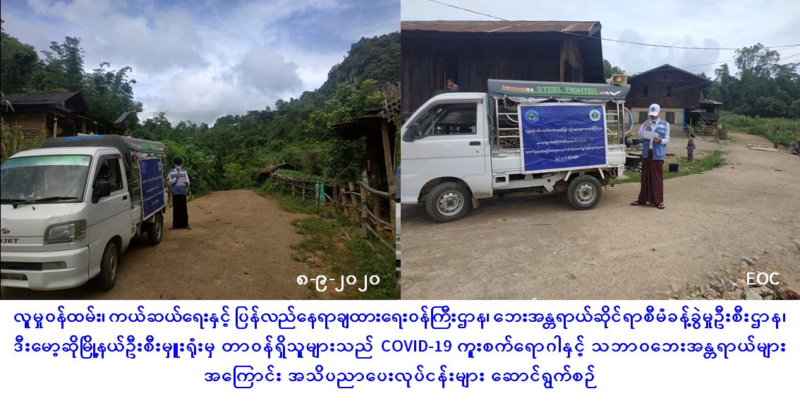 လူမှုဝန်ထမ်း၊ ကယ်ဆယ်ရေးနှင့် ပြန်လည်နေရာချထားရေးဝန်ကြီးဌာန၊ ဘေးအန္တရာယ်ဆိုင်ရာစီမံခန့်ခွဲမှုဦးစီးဌာန၊ ဒီးမော့ဆိုမြို့နယ်ဦးစီးမှူးရုံးမှ တာဝန်ရှိသူများသည် (၈-၉-၂၀၂၀) ရက်နေ့တွင် ဒီးမော့ဆိုမြို့နယ်၊ ဟိုဝမ်ကျေးရွာအုပ်စု ဟိုဝမ်ကျေးအထက်ကျေးရွာနှင့် ဟိုဝမ်အောက်ကျေးရွာ၊ လိုပူကျေးရွာအုပ်စု ဒေါဆီးအီကျေးရွာများရှိ ပြည်သူများအား COVID-19 ကူးစက်ရောဂါပြန့်ပွားမှုမဖြစ်ပွားစေရန်အတွက် သိရှိလိုက်နာရန်အချက်များနှင့် သဘာဝဘေးအန္တရာယ်နှင့်စပ်လျဉ်းသည့် ဆောင်ရန်၊ ရှောင်ရန်များကို အသိပညာဖြန့်ဝေခဲ့ကြောင်း သတင်းရရှိပါသည်။