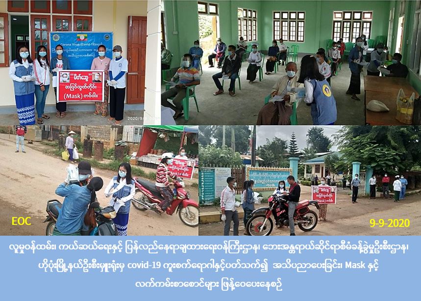 လူမှုဝန်ထမ်း၊ ကယ်ဆယ်ရေးနှင့် ပြန်လည်နေရာချထားရေးဝန်ကြီးဌာန၊ ဘေးအန္တရာယ်ဆိုင်ရာစီမံခန့်ခွဲမှုဦးစီးဌာန၊ ဟိုပုံးမြို့နယ်ဦးစီးမှူးရုံးမှ တာဝန်ရှိသူများသည် (၉-၉-၂၀၂၀) ရက်နေ့တွင် our lovely group၊ စည်ပင်သာယာရေးဌာနတို့နှင့်ပူးပေါင်း၍ ဈေးပိုင်းရပ်ကွက်ရှိပြည်သူများနှင့် စားနပ်ရိက္ခာထောက်ပံ့ခြင်း အခမ်းအနားသို့ တက်ရောက်လာကြသော ကျေးရွာ ကိုယ်စားလှယ်များအား Covid-19 အသိပညာပေး လက်ကမ်းစာစောင်များ၊ သဘာဝဘေး အသိပညာပေးလက်ကမ်းစာစောင်များနှင့် Mask များ ဖြန့်ဝေပေးခဲ့ပါကြောင်း သတင်းရရှိပါသည်။