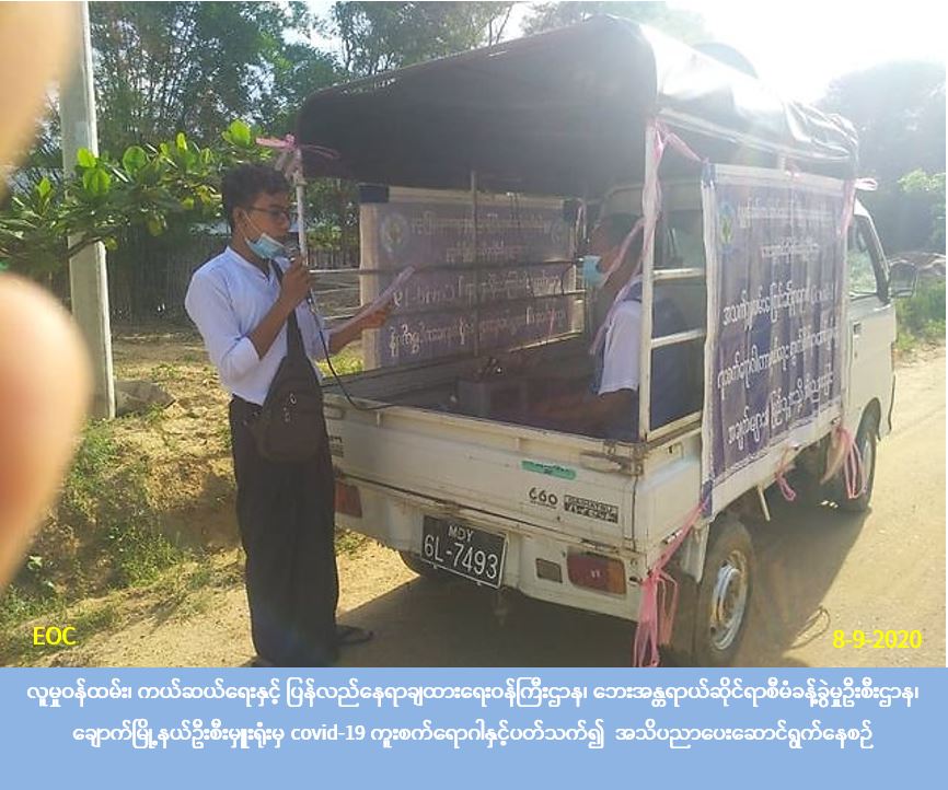 လူမှုဝန်ထမ်း၊ ကယ်ဆယ်ရေးနှင့် ပြန်လည်နေရာချထားရေးဝန်ကြီးဌာန၊ ဘေးအန္တရာယ်ဆိုင်ရာစီမံခန့်ခွဲမှုဦးစီးဌာန၊ မကွေးတိုင်းဒေသကြီး၊ ချောက်မြို့နယ်ဦးစီးမှူးရုံးမှ တာဝန်ရှိသူများသည် (၈-၉-၂၀၂၀) ရက်နေ့(၁၄:၃၀) နာရီမှ (၁၆:၃၀) နာရီအချိန်ထိ မကွေးခရိုင်၊ ချောက်မြို့၊ အမှတ်(၆၊ ၇၊ ၈၊ ၉၊ ၁၀) မြို့ပေါ်ရပ်ကွက်များသို့ COVID-19 ရောဂါနှင့် ပတ်သက်၍ ကာကွယ်၊ တားဆီး၊ ထိန်းချုပ်၊ ကုသရေးဆိုင်ရာပြည်သူလူထု အသိပညာပေးပန်ကြားချက်များကို လှည့်လည်ဟောပြောခြင်းလုပ်ငန်းများ ဆောင်ရွက်ခဲ့ပါကြောင်း သတင်းရရှိပါသည်။