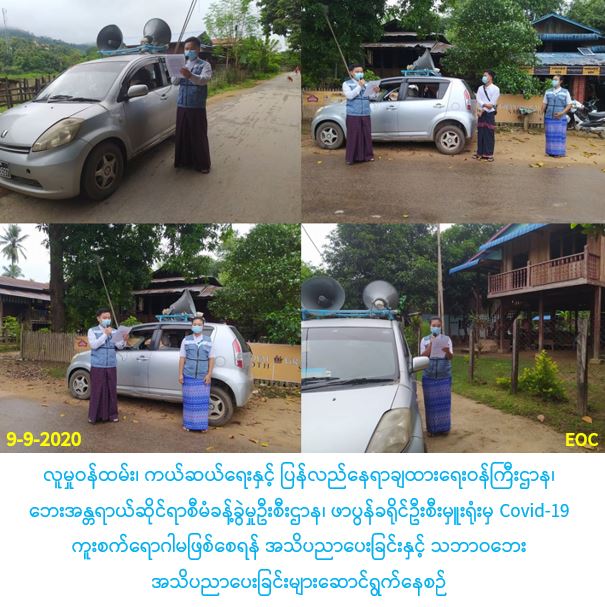 လူမှုဝန်ထမ်း၊ ကယ်ဆယ်ရေးနှင့် ပြန်လည်နေရာချထားရေးဝန်ကြီးဌာန၊ ဘေးအန္တရာယ်ဆိုင်ရာစီမံခန့်ခွဲမှုဦးစီးဌာန၊ ဖာပွန်ခရိုင်ဦးစီးမှူးရုံးမှ တာဝန်ရှိသူများသည် (၉-၉-၂၀၂၀)ရက်နေ့ နံနက်(၀၈:၀၀)နာရီချိန်မှ (၁၁:၃၀)နာရီချိန်ထိ ဖာပွန်ခရိုင်၊ ဖာပွန်မြို့အတွင်းရှိ ဆင်စွယ်ကျေးရွာ၊ ဖာလုံကျေးရွာ၊ နို့ဂေါ်ကျေးရွာနှင့် ဝါးဖိုးကုလားကျေးရွာများတွင် COVID-19 ကူးစက် မြန်ရောဂါပြန့်ပွားမှုများ မဖြစ်ပွားစေရန်အတွက် သိရှိလိုက်နာရမည့် အချက်များနှင့် မိုးရာသီကာလအတွင်း ဖြစ်ပွားတက်သော သဘာဝဘေးအန္တရာယ်များနှင့်စပ်လျဥ်း၍ ဆောင်ရန်/ရှောင်ရန်အချက်များအား အသံချဲ့စက်ဖြင့်အသိပညာပေးဆောင်ရွက်ခဲ့ပါ ကြောင်း သတင်းရရှိပါသည်။