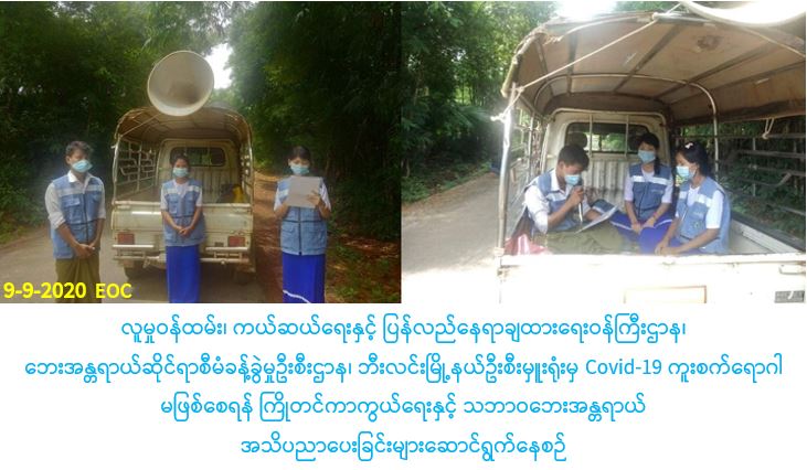 လူမှုဝန်ထမ်း၊ ကယ်ဆယ်ရေးနှင့် ပြန်လည်နေရာချထားရေးဝန်ကြီးဌာန၊ ဘေးအန္တရာယ်ဆိုင်ရာစီမံခန့်ခွဲမှုဦးစီးဌာန၊ ဘီးလင်းမြို့နယ်ဦးစီးမှူးရုံးမှ တာဝန်ရှိသူများသည် (၉-၉-၂၀၂၀) ရက်နေ့၊ (၀၈:၀၀) နာရီအချိန်မှ (၁၂:၀၀) နာရီအချိန်ထိ မွန်ပြည်နယ်၊ သထုံခရိုင်၊ ဘီးလင်းမြို့နယ်၊ သဲဖြူချောင်းကျေးရွာအုပ်စုအတွင်းရှိ သဲဖြူချောင်းကျေးရွာ၊ ဇီးကုန်းကျေးရွာ၊ ဝါးဖြူကုန်းကျေးရွာနှင့်ကျိုက်တဲကျေးရွာတို့တွင် Covid-19 ကူးစက်ရောဂါနှင့်စပ်လျဥ်း၍ ဆောင်ရန်/ရှောင်ရန်အချက်များ၊ ရေဘေး၊ မိုးကြိုးဘေး၊ မုန်တိုင်းဘေး နှင့် မြေပြိုဘေးတို့နှင့် စပ်လျဥ်း၍ ဆောင်ရန်/ရှောင်ရန်အချက်များကို အသံချဲ့စက်တို့ဖြင့် လှည့်လည်အသိပညာပေးနှိုးဆောင် ခဲ့ပြီး ဗီနိုင်းပိုစတာများ ဖြန့်ဝေပေးခဲ့ပါကြောင်း သတင်းရရှိပါသည်။