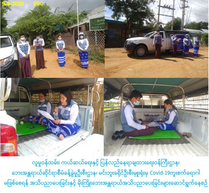 လူမှုဝန်ထမ်း၊ ကယ်ဆယ်ရေးနှင့် ပြန်လည်နေရာချထားရေးဝန်ကြီးဌာန၊ ဘေးအန္တရာယ်ဆိုင်ရာစီမံခန့်ခွဲမှုဦးစီးဌာန၊ မင်းဘူးခရိုင်ဦးစီးမှူးရုံးမှ တာဝန်ရှိသူများသည် (၉-၉-၂၀၂၀) ရက်နေ့၌ မင်းဘူး (စကု) မြို့နယ်၊ ကြာကန်ကျေးရွာ၊ အောက်ကျောင်းကျေးရွာ၊ နန်းဦးကျေးရွာ၊ လေးအိမ်တန်းကျေးရွာ၊ လက်ပတောကျေးရွာ၊ ပေါက်ကုန်းကျေးရွာတို့တွင် Covid-19 ရောဂါကြိုတင်ကာကွယ်ရေးနှင့် မိုးရာသီတွင်ဖြစ်ပွားလေ့ရှိသည့် မိုးကြိုးဘေးအန္တရာယ်များ ကြိုတင်ပြင်ဆင်ရေး အသိပညာပေး နိုးဆော်ခြင်းများကို ရပ်ကွက်အုပ်ချုပ်ရေးမှူးများနှင့်အတူ ဆောင်ရွက်ခဲ့ပါကြောင်း သတင်းရရှိပါသည်။