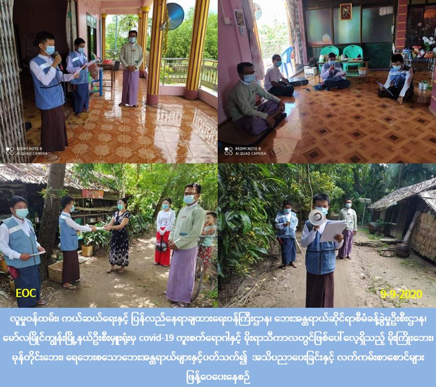 လူမှုဝန်ထမ်း၊ ကယ်ဆယ်ရေးနှင့် ပြန်လည်နေရာချထားရေးဝန်ကြီးဌာန၊ ဘေးအန္တရာယ်ဆိုင်ရာစီမံခန့်ခွဲမှုဦးစီးဌာန၊ မော်လမြိုင်ကျွန်းမြို့နယ်ဦးစီးမှူးရုံးမှ တာဝန်ရှိသူများသည် အထွေထွေအုပ်ချုပ်ရေးဦးစီးဌာန၊ ကျေးလက်ကျန်းမာရေးဌာနတို့နှင့် အတူပူးပေါင်း၍ (၉-၉-၂၀၂၀) ရက်နေ့၊ (၀၉:၀၀) နာရီအချိန်မှ (၁၃:၀၀) နာရီအချိန်ထိ မော်လမြိုင်ကျွန်းမြို့နယ်၊ ပက်ပြဲကျေးရွာအုပ်စုအတွင်းရှိ ကျုံလှကျေးရွာ၊ စခန်းချောင်းကျေးရွာ၊ ပက်ပြဲကျေးရွာ၊ ချင်းစုကျေးရွာ၊ ဦတိုကျေးရွာနှင့် ကျီးချောင်းကျေးရွာတို့အတွင်း Covid-19 ကူးစက်မှု ဒုတိယလှိုင်းမဖြစ်ပွားစေရန်အတွက် အများပြည်သူများ သိရှိလိုက်နာရန်အချက်များအား ကွင်းဆင်း၍ ကျန်းမာရေးနှင့်အားကစားဝန်ကြီးဌာနမှ ထုတ်ပြန်ထားသော အသိပေးကြေငြာချက်များ၊ မိုးရွာသီတွင်ဖြစ်ပွားတတ်သော မိုးကြိုးဘေး၊ မုန်တိုင်းဘေး၊ ရေဘေးအန္တရာယ်အသိပညာပေးခြင်းနှင့် လက်ကမ်းစာစောင်ဝေငှခြင်းများကို အများပြည်သူတို့ သိရှိလိုက်နာနိုင်စေရန် ကွင်းဆင်းလှည့်လှည်၍ Hand Speaker၊ Loud Speaker များဖြင့် အသိပညာပေးလုပ်ဆောင်မှုများ ဆောင်ရွက်ခဲ့ပါကြောင်း သတင်းရရှိပါသည်။