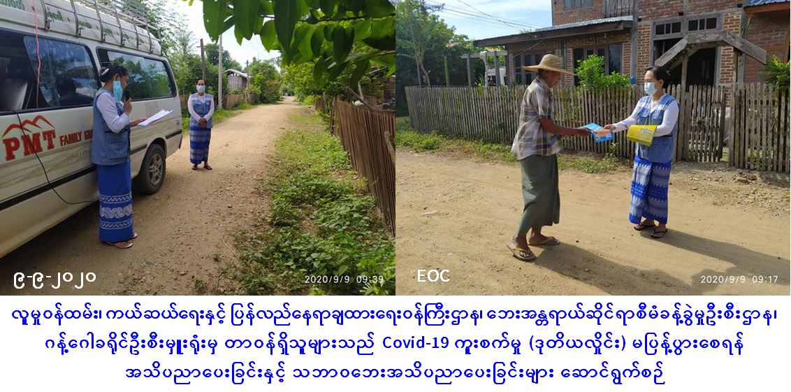 လူမှုဝန်ထမ်း၊ ကယ်ဆယ်ရေးနှင့် ပြန်လည်နေရာချထားရေးဝန်ကြီးဌာန၊ ဘေးအန္တရာယ်ဆိုင်ရာစီမံခန့်ခွဲမှုဦးစီးဌာန၊ ဂန့်ဂေါခရိုင်ဦးစီးမှူးရုံးမှ တာဝန်ရှိသူများသည် (၉-၉-၂၀၂၀) ရက်နေ့၊ (၀၈:၀၀) နာရီမှ (၁၂:၀၀) နာရီအထိ ဂန့်ဂေါမြို့နယ်၊ လာပို့ကျေးရွာနှင့် မြင်းဇာကျေးရွာများအတွင်း Covid-19 ကူးစက်ရောဂါ ဒုတိယလှိုင်း မပြန့်ပွားစေရန်နှင့် မိုးရာသီတွင်ဖြစ်ပွားလေ့ရှိသည့် သဘာဝ ဘေးအန္တရာယ်များနှင့်စပ်လျဉ်း၍ အသိပညာပေးနှိုးဆော်ခြင်းများ၊ လက်ကမ်းစာစောင်များဖြန့်ဝေခြင်းများ ဆောင်ရွက်ခဲ့ကြောင်း သတင်းရရှိပါသည်။