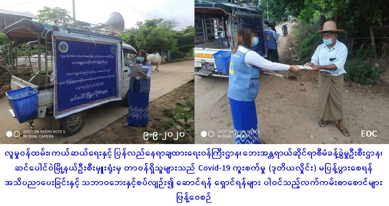 လူမှုဝန်ထမ်း၊ ကယ်ဆယ်ရေးနှင့် ပြန်လည်နေရာချထားရေးဝန်ကြီးဌာန၊ ဘေးအန္တရာယ်ဆိုင်ရာစီမံခန့်ခွဲမှုဦးစီးဌာန၊ ဆင်ပေါင်ဝဲမြို့နယ်ဦးစီးမှူးရုံးမှ တာဝန်ရှိသူများသည် (၉-၉-၂၀၂၀) ရက်နေ့တွင် ကျောက်ဆောင်စမ်းကျေးရွာအုပ်စု၊ ကျောက်ဆောင်စမ်းကျေးရွာ၊ စည်ပင်လှကျေးရွာနှင့် ဒေါင်းလှကျေးရွာများအတွင်း Covid-19 ကူးစက်ဖြစ်ပွားမှု ဒုတိယလှိုင်းမပြန့်ပွားစေရေးနှင့်ပတ်သက်၍ အများပြည်သူများသိရှိလိုက်နာရမည့်အချက်များအား အသိပေးပန်ကြားခြင်း၊ ရာသီအလိုက်ဖြစ်ပွားတတ်သော သဘာဝဘေးအန္တရာယ်များနှင့်ပတ်သက်၍ ဆောင်ရန်၊ ရှောင်ရန်အချက်များပါဝင်သည့် လက်ကမ်းစာစောင်များဝေငှခြင်းတို့ကို ဆောင်ရွက်ကြောင်း သတင်းရရှိပါသည်။