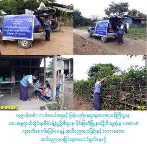 လူမှုဝန်ထမ်း၊ ကယ်ဆယ်ရေးနှင့် ပြန်လည်နေရာချထားရေးဝန်ကြီးဌာန၊ ဘေးအန္တရာယ်ဆိုင်ရာစီမံခန့်ခွဲမှုဦးစီးဌာန၊ မိုင်းဖြတ်မြို့နယ်ဦးစီးမှူးရုံးမှ တာဝန်ရှိသူများသည် (၉-၉-၂၀၂၀) ရက်နေ့၊ နံနက်ပိုင်းတွင် မိုင်းဖြတ်မြို့နယ်ရှိ ကောင်းမှု ကျေးရွာနှင့် ဘိုရှီးကျေးရွာတို့တွင် covid_19ရောဂါ ဒုတိယလှိုင်း ကူးစက်ပြန့်ပွားမှုမဖြစ်ပွားစေရန်အတွက် ကျေးရွာပြည်သူ များအား covid_19 ရောဂါနှင့်ပတ်သတ်သော ကျန်းမားရေးအမူအကျင့်များ၊ လိုက်နာဆောင်ရွက်ရမည့်စည်းကမ်းချက်နှင့် သဘာဝဘေးအသိပညာတို့အား အသံချဲ့စက်အသုံးပြု၍ ပြည်သူများသိရှိလိုက်နာနိုင်ရန်အတွက် အသိပညာပေးခြင်းနှင့် covid_19 အသိပညာပေးလက်ကမ်းစာစောင်များ၊ သဘာဝဘေးအသိပညာပေးလက်ကမ်းစာစောင်များ၊ Maskများ၊ လက်ဆေးဆပ်ပြာ တို့အား ဖြန့်ဝေပေးခြင်းများ ဆောင်ရွက်ခဲ့ပါကြောင်း သတင်းရရှိပါသည်။