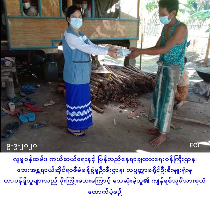 လူမှုဝန်ထမ်း၊ ကယ်ဆယ်ရေးနှင့် ပြန်လည်နေရာချထားရေးဝန်ကြီးဌာန၊ ဘေးအန္တရာယ်ဆိုင်ရာစီမံခန့်ခွဲမှုဦးစီးဌာန၊ လပွတ္တာခရိုင်ဦးစီးမှူးရုံးမှ တာဝန်ရှိသူများသည် လပွတ္တာမြို့နယ်၊ သရက်ကုန်းလဲပျောက်ကျေးရွာအုပ်စု၊ ကမ်းပြိုစုကျေးရွာ၌ (၇-၉-၂၀၂၀) ရက်နေ့၊ (၁၅:၂၀) နာရီအချိန်တွင် ဖြစ်ပွားခဲ့သော မိုးကြိုးပစ်ခတ်မှုကြောင့် သေဆုံးသူ(၁)ဦးအတွက် ထောက်ပံ့ငွေ(၃၀၀၀၀ဝိ/-)အား (၉-၉-၂၀၂၀)ရက်နေ့၊ (၀၉:၀၀) နာရီအချိန်တွင် သေဆုံးသူ၏မိသားစုဝင်များထံသို့ သွားရောက်ထောက်ပံ့ပေးအပ်ခဲ့ကြောင်း သတင်းရရှိပါသည်။