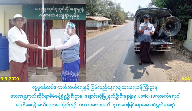 လူမှုဝန်ထမ်း၊ ကယ်ဆယ်ရေးနှင့် ပြန်လည်နေရာချထားရေးဝန်ကြီးဌာန၊ ဘေးအန္တရာယ်ဆိုင်ရာစီမံခန့်ခွဲမှုဦးစီးဌာန၊ ချောင်းဆုံမြို့နယ်ဦးစီးမှူးရုံးမှ တာဝန်ရှိသူများသည် (၉-၉-၂၀၂၀) ရက်နေ့တွင် ချောင်းဆုံမြို့နယ် အတွင်းရှိ ကမာကေးကျေးရွာ နှင့် ကွမ်လှာကျေးရွာတို့၌ COVID-19 ကူးစက်ရောဂါနှင့်စပ်လျဉ်း၍ ဆောင်ရန်/ရှောင်ရန်အချက်များနှင့် ရေဘေး၊ မုန်တိုင်းဘေး၊ မြေပြိုဘေး၊ မိုးကြိုးဘေးတို့နှင့် စပ်လျဉ်း၍ ဆောင်ရန်/ရှောင်ရန်အချက်များကို အသံချဲ့စက်တို့ဖြင့် လှည့်လှည်အသိပညာပေး နှိုးဆော်ခဲ့ပြီး လက်ကမ်းစာစောင်များ ဝေငှပေးခဲ့ပါကြောင်း သတင်းရရှိပါသည်။