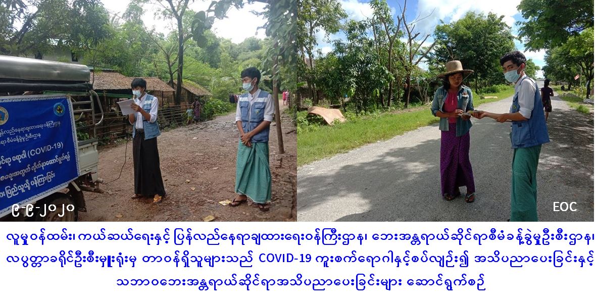 လူမှုဝန်ထမ်း၊ ကယ်ဆယ်ရေးနှင့် ပြန်လည်နေရာချထားရေးဝန်ကြီးဌာန၊ ဘေးအန္တရာယ်ဆိုင်ရာစီမံခန့်ခွဲမှုဦးစီးဌာန၊ လပွတ္တာခရိုင်ဦးစီးမှူးရုံးမှ တာဝန်ရှိသူများသည် အထွေထွေအုပ်ချုပ်ရေးဦးစီးဌာနနှင့်အတူ ပူးပေါင်း၍ (၉-၉-၂၀၂၀) ရက်နေ့၊ (၀၈:၀၀) နာရီအချိန်မှစတင်ကာ လပွတ္တာမြို့နယ်၊ သရက်ကုန်းလဲပျောက်ကျေးရွာအုပ်စု၊ သရက်ကုန်းကျေးရွာ၊ အုတ်တွင်းကျေးရွာ၊ ကညင်ချောင်းကျေးရွာ၊ ဖိုးငြိမ်းစုကျေးရွာ၊ ဖိုးမြတ်စုကျေးရွာ၊ ကျုံဖားကျေးရွာ၊ ကမ်းပြိုကျေးရွာနှင့် အုတ်တွင်းကညင်စုကျေးရွာများအတွင်း Covid-19 အသက်ရှူလမ်းကြောင်း ဆိုင်ရာရောဂါနှင့်ပတ်သက်၍ ကျန်းမာရေးနှင့်အားကစား၀န်ကြီးဌာနမှ ထုတ်ပြန်ထားသည့် အသိပေးကြေညာချက်များ၊ သဘာဝဘေးအန္တရာယ်ဆိုင်ရာအသိပညာပေးခြင်းနှင့် လက်ကမ်းစာစောင်များဝေငှခြင်းတို့ ဆောင်ရွက်ခဲ့ကြောင်း သတင်းရရှိပါသည်။