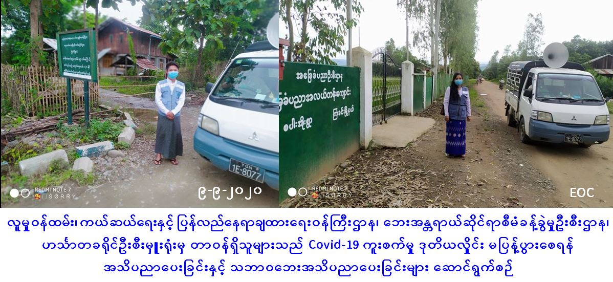 လူမှုဝန်ထမ်း၊ ကယ်ဆယ်ရေးနှင့် ပြန်လည်နေရာချထားရေးဝန်ကြီးဌာန၊ ဘေးအန္တရာယ်ဆိုင်ရာစီမံခန့်ခွဲမှုဦးစီးဌာန၊ ဟင်္သာတခရိုင်ဦးစီးမှူးရုံးမှ တာဝန်ရှိသူများသည် အထွေထွေအုပ်ချုပ်ရေးဦးစီးဌာနနှင့်အတူ ပူးပေါင်း၍ (၉-၉-၂၀၂၀) ရက်နေ့၊ နံနက် (၁၀:၀၀) နာရီအချိန်မှ (၁၂:၃၀) နာရီအချိန်ထိ ကြံခင်းမြို့နယ်၊ ပေါက်နွယ်စမ်းကျေးရွာအုပ်စု၊ (ပေါက်နွယ်စမ်း၊ စပါးအိုးအနောက်၊ စမ်းရွာ၊ မဲဇလီ) ကျေးရွာများအတွင်း ကျန်းမာရေးနှင့်အားကစားဝန်ကြီးဌာနမှ ထုတ်ပြန်ထားသော Covid-19 ကူးစက်မှု ဒုတိယလှိုင်းမဖြစ်စေရန် အသိပညာပေးခြင်းလုပ်ငန်းများနှင့် ဧရာဝတီတိုင်းဒေသကြီး Covid-19 ထိန်းချုပ်ရေးနှင့် အရေးပေါ်တုံ့ပြန်ရေးကော်မတီမှ အချိန်နှင့်တစ်ပြေးညီ ထုတ်ပြန်လျက်ရှိသည့် တားမြစ်မိန့်နှင့် ညွန်ကြားချက်အားလည်းကောင်း၊ ရာသီအလိုက်ဖြစ်ပွားတတ်သော သဘာဝဘေးများအန္တရာယ်များနှင့်ပတ်သက်သည့် သဘာဝဘေးအသိ ပညာပေးခြင်းတို့အားလည်းကောင်း အသိပညာပေးလုပ်ငန်းများ ပြုလုပ်ဆောင်ရွက်ခဲ့ကြောင်း သတင်းရရှိပါသည်။