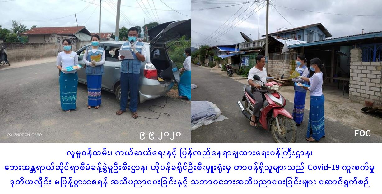 လူမှုဝန်ထမ်း၊ ကယ်ဆယ်ရေးနှင့် ပြန်လည်နေရာချထားရေးဝန်ကြီးဌာန၊ ဘေးအန္တရာယ်ဆိုင်ရာစီမံခန့်ခွဲမှုဦးစီးဌာန၊ ဟိုပန်ခရိုင်ဦးစီးမှူးရုံးမှ တာဝန်ရှိသူများသည် (၉-၉-၂၀၂၀) ရက်နေ့တွင် ဟိုပန်မြို့နယ်၊ မန်ကောင်းရပ်ကွက်နှင့် ရုံးကုန်းရပ်ကွက်များအတွင်း Covid-19 ကူးစက်မှု ဒုတိယလှိုင်း မပြန့်ပွားစေရန် ပြည်သူများ လိုက်နာရမည့်ကျန်းမာရေးအမူအကျင့်များ အသိပညာပေးခြင်းနှင့် သဘာဝဘေးဆိုင်ရာ အသိပညာပေးခြင်း၊ Mask နှင့် အသိပညာပေးလက်ကမ်းစာစောင်များ ဖြန့်ပေးဝေခြင်းတို့အား ဆောင်ရွက်ခဲ့ကြောင်း သတင်းရရှိပါသည်။