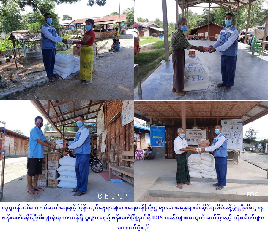 လူမှုဝန်ထမ်း၊ ကယ်ဆယ်ရေးနှင့် ပြန်လည်နေရာချထားရေးဝန်ကြီးဌာန၊ ဘေးအန္တရာယ်ဆိုင်ရာစီမံခန့်ခွဲမှုဦးစီးဌာန၊ ဗန်းမော်ခရိုင်ဦးစီးမှူးရုံးမှ တာဝန်ရှိသူများသည် (၉-၉-၂၀၂၀) ရက်နေ့၊ (၁၅:၀၀)နာရီအချိန်တွင် ဗန်းမော်မြို့နယ်၊ လီဆူနှစ်ခြင်းဘော်ဒါ IDPs စခန်းမှ အိမ်ထောင်စု (၁၁၃)စု လူဦးရေ(၆၄၅)ဦးအတွက် paris ဆပ်ပြာ(၆၄၅)ခဲ၊ ထုံးအိတ်(၁၀)အိတ်၊ နှစ်-၂၀၀၀ (RC)IDPs စခန်းမှ အိမ်ထောင်စု(၁၆၆)စု၊ လူဉီးရေ(၇၈၇)ဦးတို့အတွက် ဆပ်ပြာ(၇၈၇)ခဲ၊ ထုံး(၁၀)အိတ်၊ ရောဘတ်ကျောင်းIDPsစခန်းမှ အိမ်ထောင်စု(၆၂၈)စု၊ လူဉီးရေ(၃၉၅၅)ဦးတို့အတွက် ဆပ်ပြာ(၃၉၅၅) ခဲ၊ ထုံး(၁၀)အိတ်၊ မူရင်းနှစ်ခြင်းlDPsစခန်းမှ အိမ်ထောင်စု(၁၁)စု၊ လူဉီးရေ(၅၀)ဦးတို့အတွက် ဆပ်ပြာ(၅၀) ခဲ၊ ထုံး(၁၀)အိတ်၊ ထွယ်ဆန်ကျောင်းlDPsစခန်းမှ အိမ်ထောင်စု(၃၇)စု၊ လူဉီးရေ(၂၁၆)ဦးတို့အတွက် ဆပ်ပြာ(၂၁၆)ခဲ၊ ထုံး(၁၀) အိတ်၊ ဖန်ခါးကုန်းlDPsစခန်းမှ အိမ်ထောင်စု(၆၆)စု၊ လူဉီးရေ(၃၄၆)ဦး တို့အတွက် ဆပ်ပြာ(၃၄၆)ခဲ၊ ထုံး(၁၀) အိတ်တို့အား သွားရောက်ထောက်ပံ့ခဲ့ကြောင်း သတင်းရရှိပါသည်။