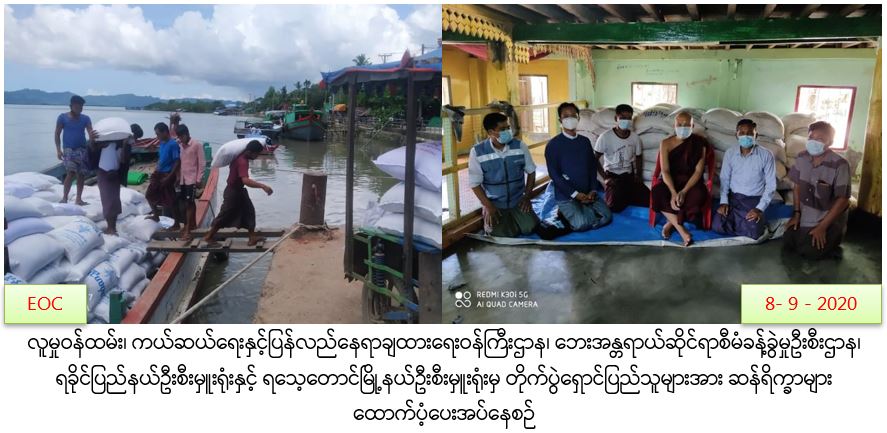 လူမှုဝန်ထမ်း၊ ကယ်ဆယ်ရေးနှင့်ပြည်လည်နေရာချထားရေးဝန်ကြီးဌာန၊ ဘေးအန္တရာယ်ဆိုင်ရာစီမံခန့်ခွဲမှုဦးစီးဌာန၊ ရခိုင်ပြည်နယ်ဦးစီးမှူးရုံးနှင့် ရသေ့တောင်မြို့နယ်ဦးစီးမှူးရုံးတို့မှ (၈-၉-၂၀၂၀)ရက် ရသေ့တောင်မြို့နယ်၊ ဆင်ခုန်တိုင်ကျေးရွာ၌ အိမ်ထောင်စု(၃၅)စု လူဦးရေ(၁၂၀)ဦး၊ ဇီးခေါင်းကျေးရွာ၌ အိမ်ထောင်စု(၃၁) စု၊ လူဦးရေ(၁၈၇)ဦး၊ သမီးလှရွာသစ်၌ အိမ်ထောင်စု(၅၆)စု၊ လူဦးရေ(၂၆၅)ဦး၊ တောင်ရင်းတန်းရပ်ကွက်၌ အိမ်ထောင်စု(၆၆၃)စု၊ လူဦးရေ(၂၆၈၉)ဦး၊ အောင်စည်ကုန်းရွာ၌ အိမ်ထောင်စု(၆၀)စု၊ လူဦးရေ(၂၂၀)ဦး၊ အရှေ့မြောက်ရပ်ကွက်၌ အိမ်ထောင်စု(၁၇၅၆)စု၊ လူဦးရေ(၆၆၀၇)ဦး၊ သိန်တောင်ကျေးရွာ၌ (၁၀၃)စု၊ လူဦးရေ(၄၃၁)ဦး၊ ကူတောင်ကျေးရွာ၌ အိမ်ထောင်စု(၄)စု၊ လူဦးရေ(၁၅)ဦး၊ ပြိန်းတောကျေးရွာ၌ အိမ်ထောင်စု(၂၄)စု၊ လူဦးရေ(၁၂၈)ဦး၊ ချောင်းဝကျေးရွာ၌ အိမ်ထောင်စု(၁၅၈)စု၊ လူဦးရေ (၆၁၁)ဦး၊ ကံပြင်ကျေးရွာ၌ အိမ်ထောင်စု(၆၆)စု၊ လူဦးရေ(၄၄၀)ဦး၊ ပြင်ဝန်းကျေးရွာ၌ အိမ်ထောင်စု(၂၃)စု၊ လူဦးရေ(၈၅)ဦး၊ စဖိုကျွန်းကျေးရွာ၌ အိမ်ထောင်စု(၂၀)စု၊ လူဦးရေ(၆၁)ဦး၊ စပါးထားကျေးရွာ၌ အိမ်ထောင်စု(၁၇၀)စု၊ လူဦးရေ(၆၆၇)ဦး၊ ပြားချောင်းကြီးကျေးရွာ၌ အိမ်ထောင်စု(၆၀)စု၊ လူဦးရေ(၂၂၀)ဦး၊ ကုန်တန်းကျေးရွာ၌ အိမ်ထောင်စု(၄၇)စု၊ လူဦးရေ(၂၀၉)ဦး စုစုပေါင်း အိမ်ထောင်စု(၃၂၇၆)စု၊ လူဦးရေ(၁၂၉၅၅)ဦး တိုက်ပွဲရှောင်ပြည်သူများအတွက် ဆန်ရိက္ခါ(၁)လစာ အတွက် (၄၀၄၈)အိတ် (၁၀)ပြည် (၄) ဗူးအားသွားရောက် ထောက်ပံ့ခဲ့ကြောင်း သတင်းရရှိပါသည်။