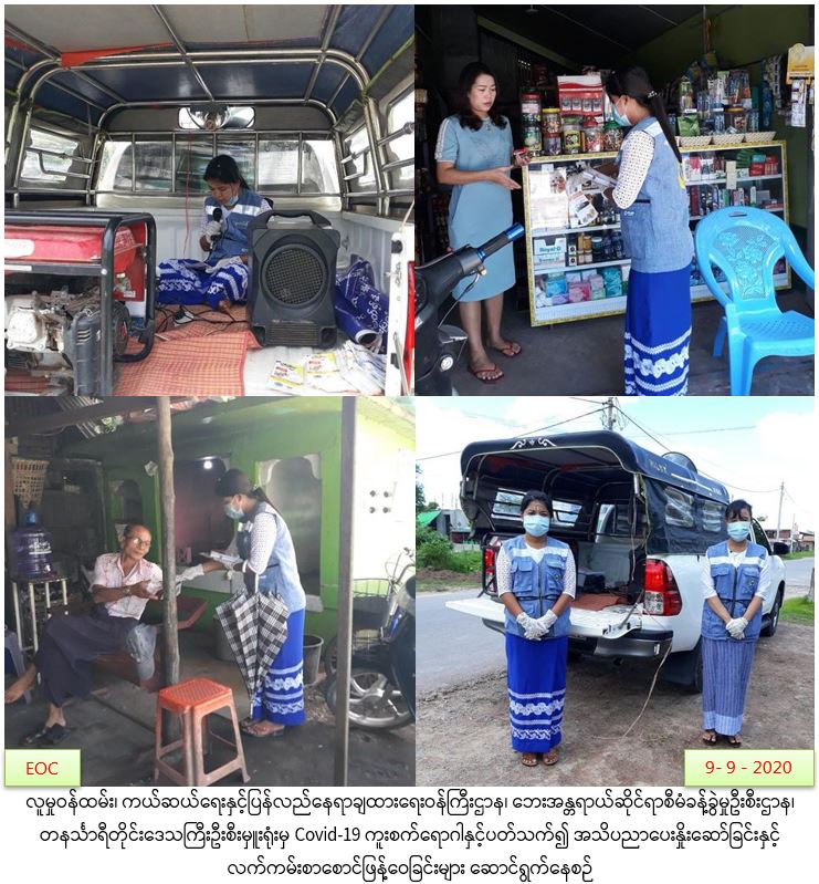 လူမှုဝန်ထမ်း၊ ကယ်ဆယ်ရေးနှင့်ပြန်လည်နေရာချထားရေးဝန်ကြီးဌာန၊ ဘေးအန္တရာယ်ဆိုင်ရာစီမံခန့်ခွဲမှုဦးစီးဌာန၊ တနင်္သာရီတိုင်းဒေသကြီးဦးစီးမှူးရုံးမှ တာဝန်ရှိသူများသည် (၉-၉-၂၀၂၀)ရက်နေ့၌ ရေဖြူမြို့နယ် အလယ်စခန်းကျေးရွာ၊ ကျောက်ကုတင်ကျေးရွာတို့တွင် ကျန်းမာရေးနှင့်အားကစားဝန်ကြီးဌာနမှ ထုတ်ပြန်ထားသော Covid-19 ကူးစက်မှု ဒုတိယလှိုင်းမဖြစ်စေရန် အသိပညာပေးခြင်း၊ ရာသီအလိုက်ဖြစ်ပွားတတ်သော သဘာဝဘေးအန္တရာယ်များနှင့်ပတ်သက်သည့် ဆောင်ရန်/ရှောင်ရန်များအား အသိအညာပေးခြင်းနှင့် သဘာဝဘေးအသိပညာပေးလက်ကမ်းစာစောင်များဝေငှခြင်းများ ဆောင်ရွက်ခဲ့ကြောင်း သတင်းရရှိပါသည်။