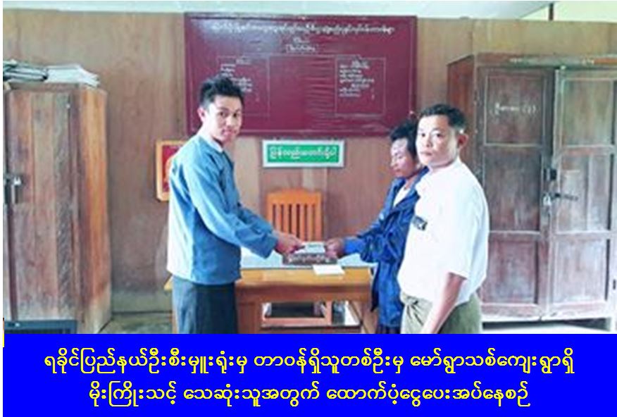 ရခိုင်ပြည်နယ်၊ မြောက်ဦးမြို့နယ်၊ မော်ရွာကျေးရွာအုပ်စု၊ မော်ရွာသစ်ကျေးရွာနေ (ဘ)ဦးမောင်သောင်း၏သား မောင်ဆန်းလင်း(၂၅)နှစ်သည် (၁၀.၈.၂၀၁၆)ရက်နေ့ နံနက်(၁၁:၁၅)နာရီတွင် မိုးကြိုးဒဏ်သင့်၍ သေဆုံးခဲ့ပါသဖြင့် (၁၆.၈.၂၀၁၆)ရက်နေ့ နံနက်(၁၀:၀၀)နာရီတွင် မြောက်ဦးမြို့နယ်အုပ်ချုပ်ရေးမှူးရုံး၌ သေဆုံးသူ၏ အစ်ကိုဖြစ်သူအား ထောက်ပံ့ငွေကျပ် (၁၀၀,၀၀၀/-)ကျပ်ကို ရခိုင်ပြည်နယ်ကယ်ဆယ်ရေးဦးစီးမှူးရုံးမှ ထောက်ပံ့ပေးအပ်ခဲ့ကြောင်း သတင်းရရှိပါသည်။