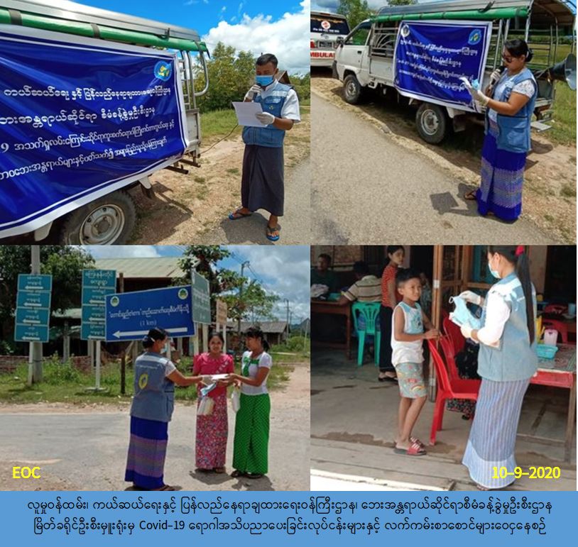 လူမှုဝန်ထမ်း၊ ကယ်ဆယ်ရေးနှင့် ပြန်လည်နေရာချထားရေးဝန်ကြီးဌာန၊ ဘေးအန္တရာယ်ဆိုင်ရာ စီမံခန့်ခွဲမှုဦးစီးဌာန၊ မြိတ်ခရိုင်ဦးစီးမှူးရုံးမှ တာဝန်ရှိသူများသည် (၁၀-၉-၂၀၂၀)နေ့တွင် COVID-19 အသိပညာပေးဆောင်ရွက်မှု သံသရာအေးလူမှုအထောက်အကူပြု ပရဟိတအသင်း တို့နှင့် ပူးပေါင်း၍ ပျဉ်းတောင်၊ တပ်တောင် ၊ တောင်ယာတဲ၊ စလွန်း၊ တောင်ညို၊ တောင်ရှည်၊ ကန်သာယာ၊ တောင်ကြီး၊ ကင်းဆိုး၊ မော်တောင်၊ ကလင်ဘန်းကျေးရွာတို့တွင် COVID-19 ကူးစက်ရောဂါ (ဒုတိယလှိုင်း) အသက်ရှူလမ်းကြောင်းဆိုင်ရာရောဂါ မဖြစ်ပွားစေရေးအတွက် အများပြည်သူသိရှိလိုက်နာနိုင်ရန် ကျန်းမာရေးနှင့် အားကစားဝန်ကြီးဌာနက ထုတ်ပြန်ထား သော အသိပေးကြေငြာချက်များနှင့် မိုးကြိုးဘေး၊ ရေဘေး၊ လေပြင်းဘေး ဆောင်ရန် /ရှောင်ရန် များ အသိပညာပေးဆောင်ရွက်ပြီး၊ လက်ကမ်းစာစောင်နှင့် Mask များအားဝေငှခဲ့ပါကြောင်း သတင်းရရှိပါသည်။