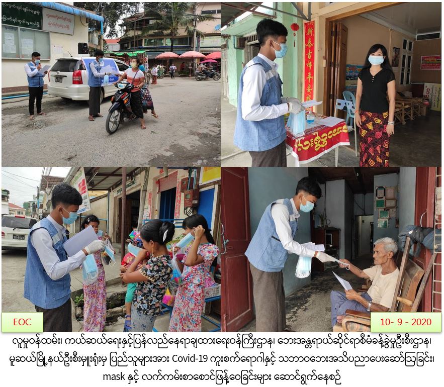 လူမှုဝန်ထမ်း၊ ကယ်ဆယ်ရေးနှင့်ပြန်လည်နေရာချထားရေးဝန်ကြီးဌာန၊ ဘေးအန္တရာယ်ဆိုင်ရာစီမံခန့်ခွဲမှုဦးစီးဌာန၊ မူဆယ်မြို့နယ်ဦးစီးမှူးရုံးမှ တာဝန်ရှိသူများသည် (၁၀.၉.၂၀၂၀)ရက်နေ့ မူဆယ်မြို့နယ်၊ မြောက်ရပ်ကွက်၌ Covid-19 ဒုတိယလှိုင်းကာလအတွင်း ပြည်သူများလိုက်နာရမည့် ကျန်းမာရေးအမူအကျင့်များအသိပညာပေးခြင်းနှင့် သဘာဝဘေးဆိုင်ရာအသိပညာပေးခြင်းများကို Hand Speaker အသံချဲ့စက်များဖြင့် လှည့်လည်ဟောပြောခြင်း၊ Mask နှင့် အသိပညာပေးလက်ကမ်းစာစောင်များ ဖြန့်ဝေပေးခြင်းများ ဆောင်ရွက်ခဲ့ကြောင်း သတင်းရရှိပါသည်။
