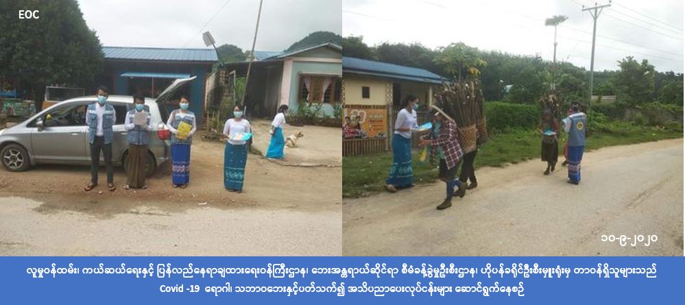 (၁၀-၉-၂၀၂၀) ရက်နေ့တွင် လူမှုဝန်ထမ်း၊ ကယ်ဆယ်ရေးနှင့်ပြန်လည်နေရာချထားရေးဝန်ကြီးဌာန၊ ဘေးအန္တရာယ်ဆိုင်ရာ စီမံခန့်ခွဲမှုဦးစီးဌာန၊ ဟိုပန်ခရိုင်ဦးစီးမှူးရုံးမှ တာဝန်ရှိသူများသည် ဟိုပန်မြို့နယ်၊ မိန်းပန်းရပ်ကွက်နှင့် ရွှေဝါကျေးရွာတို့၌ (Covid-19) ဒုတိယလှိုင်းကာလအတွင်း ပြည်သူများ လိုက်နာရမည့်ကျန်းမာရေးအမူအကျင့်များ အသိပညာပေးခြင်းနှင့် သဘာဝဘေးဆိုင်ရာ အသိပညာပေးခြင်း၊ Mask နှင့် အသိပညာပေးလက်ကမ်းစာစောင်များ ဖြန့်ပေးဝေခြင်းတို့ကို ဆောင်ရွက်ခဲ့ကြောင်း သိရှိရပါသည်။