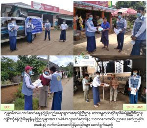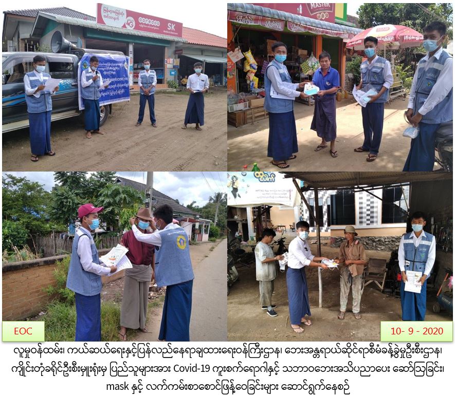 လူမှုဝန်ထမ်း၊ ကယ်ဆယ်ရေးနှင့်ပြန်လည်နေရာချထားရေးဝန်ကြီးဌာန၊ ဘေးအန္တရာယ်ဆိုင်ရာစီမံခန့်ခွဲမှုဦးစီးဌာန၊ ကျိုင်းတုံခရိုင်ဦးစီးမှူးရုံး မှ တာဝန်ရှိသူများသည် (၁၀.၉.၂၀၂၀)ရက်နေ့တွင် ကျိုင်းတုံခရိုင် လူမှုဝန်ထမ်းဦးစီးဌာနနှင့် ပူးပေါင်း၍ ကျိုင်းတုံမြို့နယ်၊ ကတ်ထိုက်ကျေးရွာအုပ်စု၊ ကတ်ထိုက်ကျေးရွာ၊ တင်ထပ်ကျေးရွာ၊ နောင်ရှန်ကျေးရွာ၊ ဟိုယန်းကျေးရွာ၊ တုံစီ ကျေးရွာ၊ တုံကွမ်ကျေးရွာတို့၌ Covid-19 ဒုတိယလှိုင်းကာလအတွင်း ပြည်သူများ လိုက်နာရမည့်ကျန်းမာရေးအမူအကျင့်များ အသိပညာပေးခြင်းနှင့် သဘာဝဘေးဆိုင်ရာ အသိပညာပေးခြင်းများကို Hand Speaker အသံချဲ့စက်များဖြင့် လှည့်လည်ဟောပြောခြင်း ၊ Mask နှင့် အသိပညာပေးလက်ကမ်းစာစောင်များ ဖြန့်ပေးဝေခြင်းတို့အား ဆောင်ရွက်ခဲ့ကြောင်း သတင်းရရှိပါသည်။