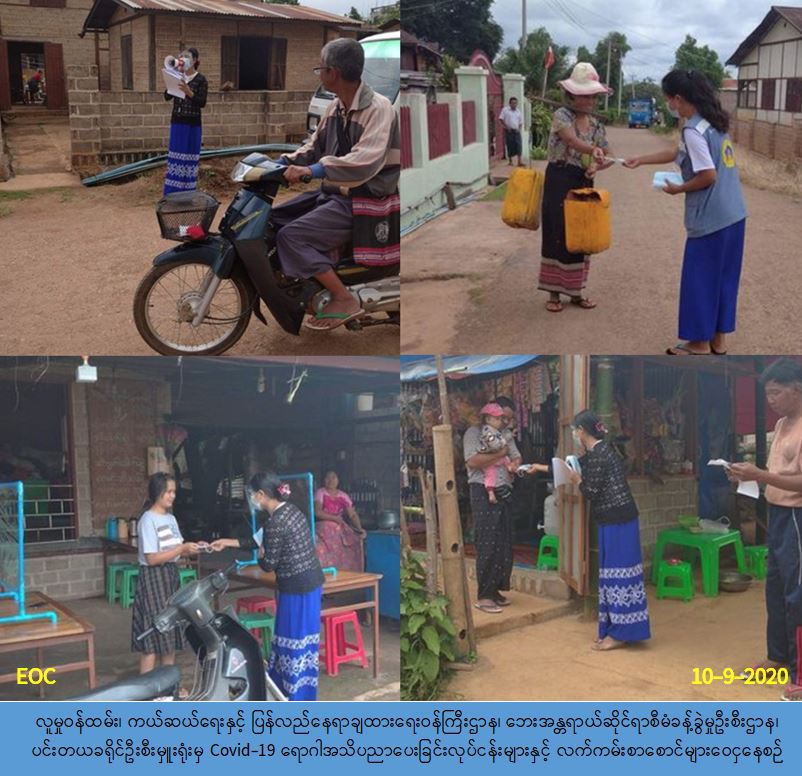 လူမှုဝန်ထမ်း၊ ကယ်ဆယ်ရေးနှင့် ပြန်လည်နေရာချထားရေးဝန်ကြီးဌာန၊ ဘေးအန္တရာယ်ဆိုင်ရာ စီမံခန့်ခွဲမှုဦးစီးဌာန၊ ပင်းတယမြို့နယ်ဦးစီးမှူးရုံးမှ တာဝန်ရှိသူများသည် (၁၀-၉-၂၀၂၀) ရက် နေ့တွင် ပင်းတယမြို့ ပြည်တော်သာရပ်ကွက်နှင့် ရပ်ကွက်အတွင်းရှိ လက်ဆောင်ပစ္စည်း ဆိုင်များအား covid-19 ဒုတိယလှိုင်းကာလအတွင်း ပြည်တွင်းကူးစက်ပြန့်ပွားမှု ကြိုတင်ကာ ကွယ်ရေးအသိပညာပေးခြင်း၊ သဘာဝဘေးအန္တရာယ်များဆိုင်ရာ အသိပညာပေးခြင်းများကို Hand-Speaker များဖြင့် လှည့်လည်ဟောပြောခြင်း၊ Maskနှင့် အသိပညာပေးလက်ကမ်း စာစောင်များ ဖြန့်ဝေခြင်းများဆောင်ရွက်ခဲ့ပါကြောင်း သတင်းရရှိပါသည်။