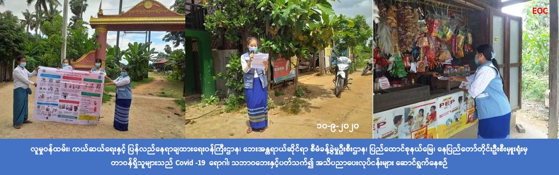 လူမှုဝန်ထမ်း၊ ကယ်ဆယ်ရေးနှင့် ပြန်လည်နေရာချထားရေးဝန်ကြီးဌာန၊ ဘေးအန္တရာယ်ဆိုင်ရာစီမံခန့်ခွဲမှုဦးစီးဌာန၊ ပြည်ထောင်စုနယ်မြေ၊ နေပြည်တော်တိုင်းဦးစီးမှူးရုံးမှ တာဝန်ရှိသူများသည် (၁၀-၉-၂၀၂၀) ရက်နေ့၊ (၀၉:၃၀) အချိန်မှ (၁၅:၀၀) အချိန်အထိ ပြည်သူများအား COVID-19 ရောဂါကူးစက်ပြန့်နှံ့မှုများမဖြစ်ပွားစေရန်အတွက် သိရှိလိုက်နာ ဆောင်ရွက်ရမည့်အချက်များနှင့် မိုးရာသီကာလအတွင်း ဖြစ်ပွားတတ်သည့် ရေဘေးအန္တရာယ်နှင့် မိုးကြိုးဘေးအန္တရာယ် ဆိုင်ရာ ဆောင်ရန်/ ရှောင်ရန်အချက်များနှင့်ပတ်သက်၍ အသိပညာပေးခြင်းကို လယ်ဝေးမြို့နယ်၊ ခရမ်းကိုင်းကျေးရွာ အုပ်စု၊ ခရမ်းကိုင်းကျေးရွာ၊ ဆင်ဆိပ်ကျေးရွာ၊ ညောင်ကုန်းကျေးရွာ၊ မန်ကျည်းကုန်းကျေးရွာနှင့် သရက်ခုန်ကျေးရွာအတွင်း ရှိ ပြည်သူများသို့ လက်ကမ်းစာစောင်များနှင့် ဗီနိုင်းပိုစတာများဖြန့်ဝေပေးအပ်၍ ထိရောက်စွာ ဆောင်ရွက်ခဲ့ကြောင်း သိရှိရပါသည်။