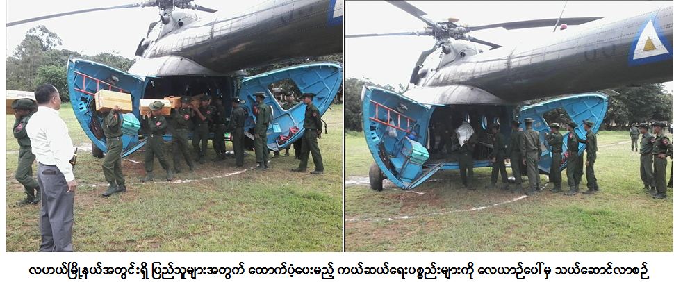 – ထိုသို့ပို့ဆောင်လျက်ရှိရာ (၁၅-၈-၂၀၁၆) နေ့တွင် တန်ချိန် (၇) တန်ရှိ ဆန်၊ ဆီ၊ ကုလားပဲ၊ ငါးသေတ္တာများကို ရန်ကုန်မြို့၊ မင်္ဂလာဒုံလေတပ်စခန်းဌာနချုပ်မှ ဟုမ္မလင်းမြို့သို့ တပ်မတော် Y-8 လေယာဉ်ဖြင့်ပို့ဆောင်ခဲ့ရာ ရန်ကုန်တိုင်းဒေသကြီးဦးစီးမှူး ဦး၀င်းရွှေ နှင့်အဖွဲ့မှ လိုက်ပါ ဆောင်ရွက်ခဲ့ပါသည်။