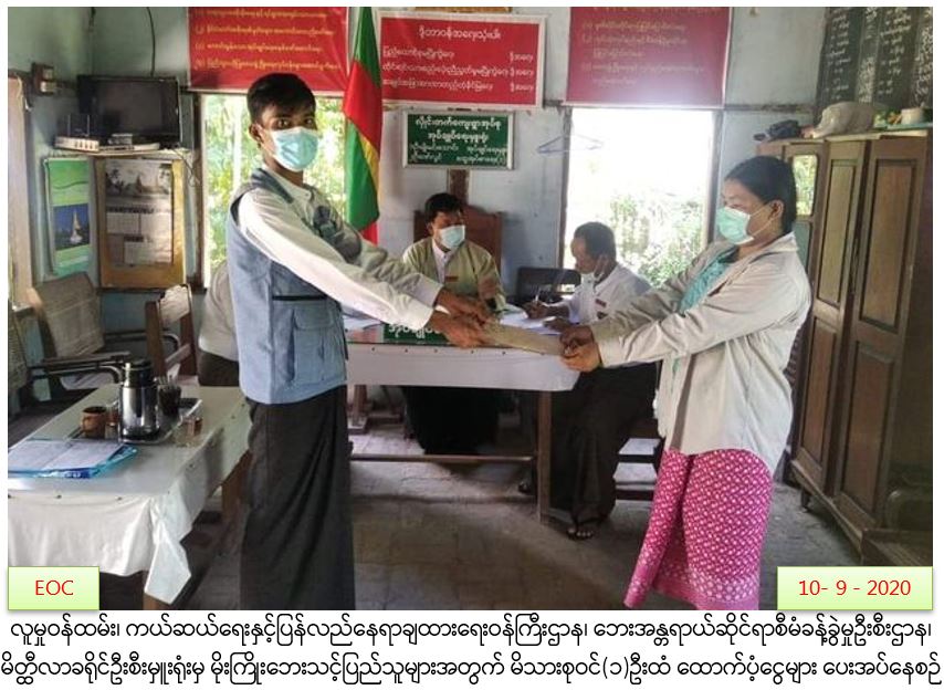 လူမှုဝန်ထမ်း၊ ကယ်ဆယ်ရေးနှင့်ပြန်လည်နေရာချထားရေးဝန်ကြီးဌာန၊ ဘေးအန္တရာယ်ဆိုင်ရာစီမံခန့်ခွဲမှုဦးစီးဌာန၊ မိတ္ထီလာခရိုင်ဦးစီးမှူးရုံးမှတာဝန်ရှိသူများသည် (၈.၉.၂၀၂၀)ရက်နေ့တွင် မိုးကြိုးဘေးဖြစ်ပွားခဲ့သည့် မိထ္ထီလာခရိုင်၊ သာစည်မြို့နယ်၊ လှိုင်းတက်ကျေးရွာအုပ်စု၊ စိုက်ပျိုးရေးကျေးရွာနေ ဦးဇော်ဝင်းအောင်၊ အသက်(၃၈)နှစ်မှာ ဆိုင်ကယ်စီးနေစဥ် မိုးကြိုးထိမှန်သေဆုံးခဲ့ပြီး နောက်မှလိုက်ပါလာသူဇနီးဒေါ်ယုယုဆွေ(၃၆)နှစ်မှာဒဏ်ရာရရှိခဲ့ပါသည်။ ထိုမိုးကြိုးဘေးကြောင့် သေဆုံးသူအတွက် (၃၀၀၀၀၀)ကျပ်၊ ဒဏ်ရာရရှိခဲ့သူ(၁)ဦးအတွက် (၅၀၀၀၀)ကျပ်တို့ကို မိုးကြိုးဘေးသင့်သူမိသားစုဝင်ထံသို့ (၁၀.၉.၂၀၂၀)ရက်နေ့(၁၁)နာရီတွင် သွားရောက်ထောက်ပံ့ပေးအပ်ခဲ့ကြောင်း သတင်းရရှိပါသည်။