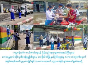 လူမှုဝန်ထမ်း၊ ကယ်ဆယ်ရေးနှင့် ပြန်လည်နေရာချထားရေးဝန်ကြီးဌာန၊ ဘေးအန္တရာယ်ဆိုင်ရာစီမံခန့်ခွဲမှုဦးစီးဌာန၊ တာချီလိတ်မြို့နယ်ဦးစီးမှူးရုံးမှ တာဝန်ရှိသူများသည် (၁၀-၉-၂၀၂၀) ရက်နေ့ အထွေထွေအုပ်ချုပ်ရေးဦးစီးဌာန၊ ဒုတိယခရိုင် အုပ်ချုပ်ရေးမှူးနှင့်အတူ တာချီလိတ်ခရိုင်ရဲတပ်ဖွဲ့ဝင်များ၊ ယာဉ်ထိန်းရဲတပ်ဖွဲ့၊ လူမှုဝန်ထမ်းဦးစီးဌာန၊ မြို့နယ်မီးသတ်ဦးစီးဌာန၊ မဇ္ဇျိမလူမှုကူညီရေးအသင်း၊ ခရိုင်ကြက်ခြေနီတပ်ဖွဲ့တို့နှင့်ပူးပေါင်း၍ ဆန်ဆိုင်း(ခ)ရပ်ကွက်အတွင်းရှိ မီးပွိုင့်များနှင့် အနီးပတ်ဝန်းကျင်တွင် (COVID-19) ရောဂါကူးစက်မှု ဒုတိယလှိုင်း မဖြစ်ပွားစေရေး အတွက် ကြိုတင်ကာကွယ်ရေး နည်းလမ်းများကိုလည်းကောင်း၊ သဘာဝဘေးနှင့် ပတ်သတ်သည့် ဆောင်ရန် / ရှောင်ရန်များကို လည်းကောင်း Hand Speaker ဖြင့်အသိပညာပေးဆော်သြခြင်း၊ hand gel များဖြင့် လက်သန့်စင်စေခြင်း၊ မဖြစ်မနေအပြင်ထွက်ရပါက mask ကိုအမြဲတပ်ဆင် သွားကြရန်အသိပေးပြောကြားပြီး mask များဖြန့်ဝေခြင်း၊ သဘာဝဘေးအသိပညာပေးလက်ကမ်းစာစောင်များနှင့် ဗီနိုင်း/ ပိုစတာများ ကပ်ခြင်းတို့ကို ဆောက်ရွက်ခဲ့ကြပါကြောင်း သတင်းရရှိပါသည်။