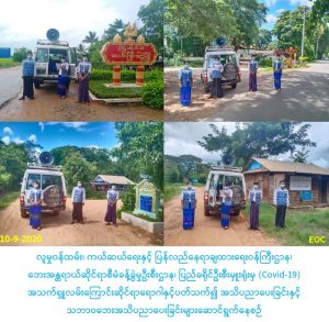 လူမှုဝန်ထမ်း၊ ကယ်ဆယ်ရေးနှင့် ပြန်လည်နေရာချထားရေးဝန်ကြီးဌာန၊ ဘေးအန္တရာယ်ဆိုင်ရာစီမံခန့်ခွဲမှုဦးစီးဌာန၊ ပြည်ခရိုင်ဦးစီးမှူးရုံးမှ တာဝန်ရှိသူများသည် (၁၀-၉-၂၀၂၀) ရက်နေ့တွင် ပြည်ခရိုင်၊ သဲကုန်းမြို့နယ်၊ အမှတ်(၁)၊ အမှတ်(၂)၊ အမှတ်(၃)ရပ်ကွက်များ ကွေ့တက်ကျေးရွာ၊ ဈေးတန်းကျေးရွာနှင့် ဆင်မြီးဆွဲမြို့တို့တွင် (Covid-19) အသက်ရှူလမ်းကြောင်း ဆိုင်ရာရောဂါနှင့်ပတ်သက်၍ အများပြည်သူများသိရှိလိုက်နာနိုင်ရန် ကျန်းမာရေးနှင့် အားကစားဝန်ကြီးဌာနမှ ထုတ်ပြန်ထား သော အသိပေးကြေညာချက်များနှင့် မိုးကြိုးဘေး၊ လေဘေး၊ ရေဘေးနှင့်စပ်လျဉ်း၍ ဦးစီးဌာနမှ ထုတ်ပြန်ထားသည့် လက်ကမ်းစာစောင်များပါ ဆောင်ရန်/ရှောင်ရန်များအား အသိပညာပေးခြင်းများ ပြုလုပ်ခဲ့ပါကြောင်း သတင်းရရှိပါသည်။
