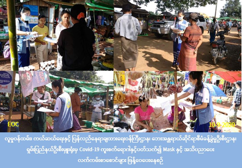 လူမှုဝန်ထမ်း၊ ကယ်ဆယ်ရေးနှင့် ပြန်လည်နေရာချထားရေးဝန်ကြီးဌာန၊ ဘေးအန္တရာယ်ဆိုင်ရာစီမံခန့်ခွဲမှုဦးစီးဌာန၊ ရှမ်းပြည်နယ်ဦးစီးမှူးရုံးမှ တာဝန်ရှိသူများသည် (၁၀-၉-၂၀၂၀) ရက်နေ့တွင် တောင်ကြီးမြို့နယ်၊ အေးသာယာမြို့နောင်အင်ဈေး၌ COVI-19 ဒုတိယလှိုင်းကာလအတွင်း ပြည်သူများ လိုက်နာရမည့်ကျန်းမာရေးအမူအကျင့်များ အသိပညာပေးခြင်းနှင့် သဘာဝဘေးဆိုင်ရာ အသိပညာပေးခြင်းများကို Hand Speaker အသံချဲ့စက်များဖြင့် လှည့်လည်ဟောပြောခြင်း၊ Mask နှင့် အသိပညာပေးလက်ကမ်းစာစောင်များ ဖြန့်ပေးဝေခြင်းတို့အား ဆောင်ရွက်ခဲ့ပါကြောင်း သတင်းရရှိပါသည်။