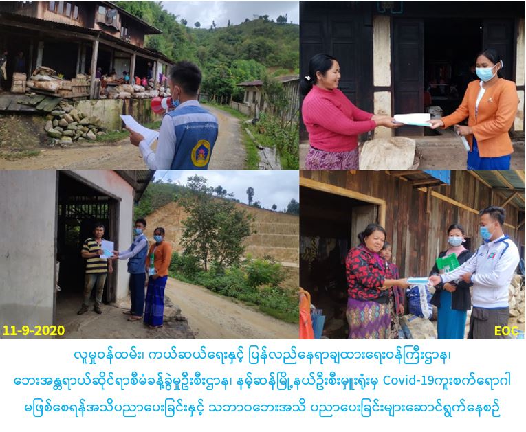 လူမှုဝန်ထမ်း၊ ကယ်ဆယ်ရေးနှင့် ပြန်လည်နေရာချထားရေးဝန်ကြီးဌာန၊ ဘေးအန္တရာယ်ဆိုင်ရာစီမံခန့်ခွဲမှုဦးစီးဌာန၊ နမ့်ဆန်မြို့နယ်ဦးစီးမှူးရုံးမှ တာဝန်ရှိသူများသည် (၁၁-၉-၂၀၂၀)ရက်နေ့တွင် အထွေအထွေအုပ်ချုပ်ရေးဦးစီးဌာန၊ လူမှုဝန်ထမ်းဦးစီးဌာန တို့နှင့် ပူးပေါင်း၍ ပလောင်ကိုယ်ပိုင်အုပ်ချုပ်ခွင့်ရဒေသ၊ နမ့်ဆန်မြို့နယ်၊ ကယားလမ်းကျေးရွာအုပ်စု၊ ကယားလမ်းကျေးရွာနှင့် ဟိုချောင်းကျေးရွာတို့၌ Covid-19 ဒုတိယလှိုင်းကာလအတွင်း ပြည်သူများ လိုက်နာရမည့် ကျန်းမာရေးအမူအကျင့်များ အသိပညာပေးခြင်းနှင့် သဘာဝဘေးဆိုင်ရာ အသိပညာပေးခြင်းများကို Hand Speaker ဖြင့် လှည့်လည်ဟောပြောခြင်း ၊ Mask နှင့် အသိပညာပေးလက်ကမ်းစာစောင်များ ဖြန့်ပေးဝေခြင်းတို့အား ဆောင်ရွက်ခဲ့ပါကြောင်း သတင်းရရှိပါသည်။