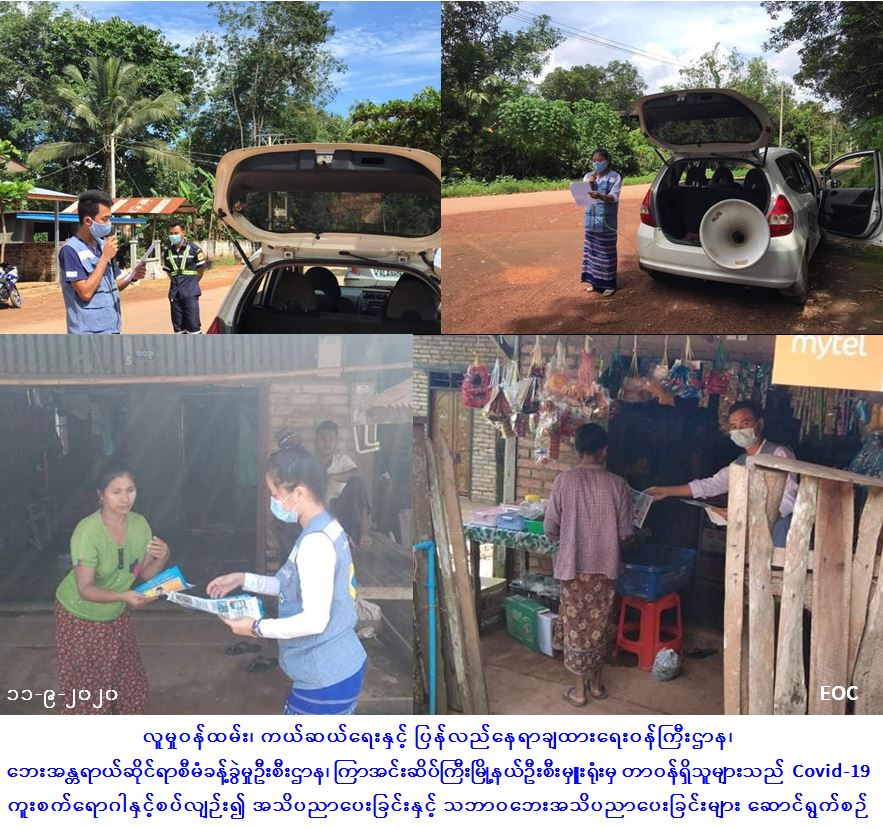 လူမှုဝန်ထမ်း၊ ကယ်ဆယ်ရေးနှင့် ပြန်လည်နေရာချထားရေးဝန်ကြီးဌာန၊ ဘေးအန္တရာယ်ဆိုင်ရာစီမံခန့်ခွဲမှုဦးစီးဌာန၊ ကြာအင်းဆိပ်ကြီးမြို့နယ်ဦးစီးမှူးရုံးမှ တာဝန်ရှိသူများသည် (၁၁-၉-၂၀၂၀) ရက်နေ့၊ (၀၈:၀၀) နာရီမှ (၁၂:၀၀) နာရီထိ ကြာအင်းဆိပ်ကြီးမြို့နယ်အတွင်းရှိ ခလယ်ရွာလေးကျေးရွာ၊ နောင်းဒေ့ကျေးရွာနှင့် မြို့ဟောင်းကျေးရွာများ၌ COVID-19 ကူးစက်ရောဂါ ပြန့်ပွားမှုများမရှိစေရန် သိရှိလိုက်နာရမည့်အချက်များနှင့် မိုးရာသီကာလအတွင်း ဖြစ်ပွားတတ် သော သဘာဝဘေးအန္တရာယ်များနှင့်စပ်လျဉ်း၍ ဆောင်ရန်/ရှောင်ရန်အချက်များအား ကျေးရွာနေပြည်သူများထံ အသိပညာပေးဆောင်ရွက်ခဲ့ပြီး လက်ကမ်းစာစောင်များ ဖြန့်ဝေခဲ့ကြောင်း သတင်းရရှိပါသည်။