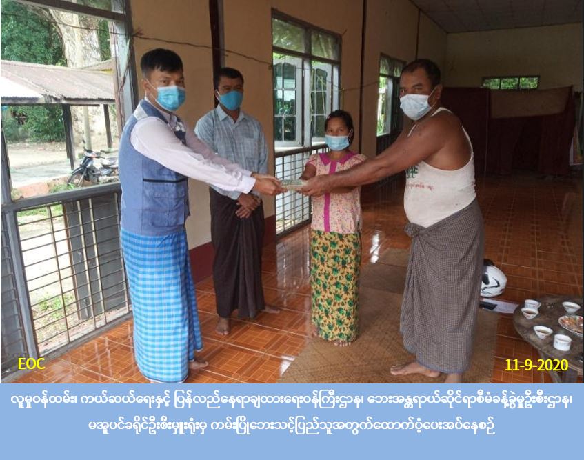 လူမှုဝန်ထမ်း၊ ကယ်ဆယ်ရေးနှင့် ပြန်လည်နေရာချထားရေးဝန်ကြီးဌာန၊ ဘေးအန္တရာယ်ဆိုင်ရာစီမံခန့်ခွဲမှုဦးစီးဌာန၊ မအူပင်ခရိုင်ဦးစီးမှူးရုံးမှ တာဝန်ရှိသူများသည် မအူပင်ခရိုင်၊ မအူပင်မြို့နယ်၊ မီးသွေးချောင်းကျေးရွာအုပ်စု၊ သောင်တန်းကျေးရွာ၌ (၁၀-၉-၂၀၂၀) ရက်နေ့တွင် ဖြစ်ပွားခဲ့သော ကမ်းပြိုဘေးကြောင့် ကြိုတင်ဖျက်သိမ်းပြောင်းရွေ့နေအိမ်(၂)လုံး၊ အိမ်ထောင်စု(၂)စုမှ လူဦးရေ(၁၀)ဦးအတွက် အိမ်ဆောက်ပစ္စည်းဖိုးရန်ပုံငွေ (၂၀၀,၀၀၀) ကျပ်၊ ဆန်ရိက္ခာ (၇) ရက်စာဖိုးရန်ပုံငွေ (၂၁,၀၀၀)ကျပ်၊ စုစုပေါင်းကယ်ဆယ်ရေးရန်ပုံငွေ (၂၂၁,၀၀၀) ကျပ်အား (၁၁-၉-၂၀၂၀) ရက်နေ့၊ (၁၃:၁၀) အချိန်တွင် ကျေးရွာအုပ်ချုပ်ရေးမှူး၊ ရပ်မိရပ်ဖများရှေ့မှောက်၌ ဘေးသင့်ပြည်သူများ လက်ဝယ်အရောက် သွားရောက်ထောက်ပံ့ပေးအပ်ခဲ့ပါကြောင်း သတင်းရရှိပါသည်။