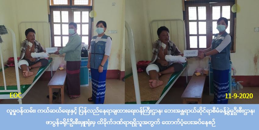 လူမှုဝန်ထမ်း၊ ကယ်ဆယ်ရေးနှင့် ပြန်လည်နေရာချထားရေးဝန်ကြီးဌာန၊ ဘေးအန္တရာယ်ဆိုင်ရာစီမံခန့်ခွဲမှုဦးစီးဌာန၊ ဖာပွန်ခရိုင်ဦးစီးမှူးရုံးမှ တာဝန်ရှိသူများသည် (၉-၉-၂၀၂၀) ရက်နေ့၊ (၁၂:၃၀) အချိန်ခန့်တွင် ဖာပွန်မြို့နယ်၊ တံခွန်တိုင်ကျေးရွာအုပ်စု၊ ဝှေမှုန်ကျေးရွာမှ ကိုင်းခြံမြေအတွင်း မြက်ဖြတ်စက်ဖြင့် ပေါင်းမြက်များရှင်းလင်းနေစဥ်မြေမြှုပ်မိုင်းဟောင်းတစ်လုံးအား ထိမိခဲ့ပြီး ဒဏ်ရာရရှိခဲ့သောဒဏ်ရာရလူနာ (၁) ဦးအတွက် ထောက်ပံ့ငွေ (၅၀,၀၀၀) ကျပ်တိတိအား (၁၁-၉-၂၀၂၀) ရက်နေ့၊ (၁၂:ဝဝ) နာရီအချိန်တွင် ဖာပွန်မြို့ရှိ ပြည်သူ့ဆေးရုံသို့ လက်ဝယ်အရောက်သွားရောက်ထောက်ပံ့ခဲ့ပါကြောင်း သတင်းရရှိပါသည်။