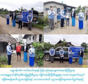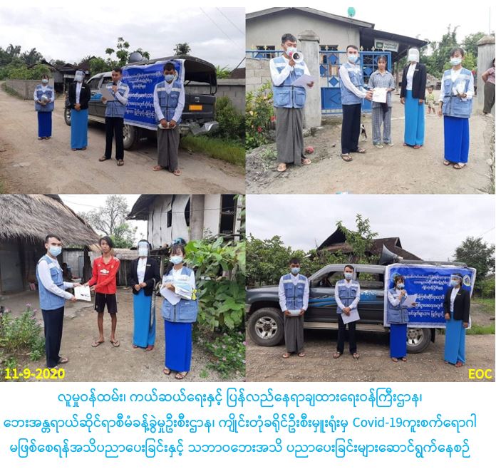 လူမှုဝန်ထမ်း၊ ကယ်ဆယ်ရေးနှင့် ပြန်လည်နေရာချထားရေးဝန်ကြီးဌာန၊ ဘေးအန္တရာယ်ဆိုင်ရာစီမံခန့်ခွဲမှုဦးစီးဌာန၊ ကျိုင်းတုံခရိုင်ဦးစီးမှူးရုံးမှ တာဝန်ရှိသူများသည် ကျိုင်းတုံခရိုင်လူမှုဝန်ထမ်းဦးစီးဌာနနှင့်ပူးပေါင်း၍ ကျိုင်းတုံမြို့နယ်၊ ယန်းလော့ကျေးရွာအုပ်စု၊ ယန်းလော့ကျေးရွာ၊ ဖိုင်ဘိန်းကျေးရွာ၊ နမ့်ဝေါ်စန့် ကျေးရွာ၊ ဟန်ဟိုင်းကျေးရွာ၊ ဝမ်မောက်ကျေးရွာ၊ ဝမ်လောက်ကျေးရွာတို့၌ Covid-19 ဒုတိယလှိုင်းကာလအတွင်း ပြည်သူများ လိုက်နာရမည့်ကျန်းမာရေးအမူအကျင့်များ အသိပညာပေးခြင်းနှင့် သဘာဝဘေးဆိုင်ရာ အသိပညာပေးခြင်းများကို Hand Speaker အသံချဲ့စက်များဖြင့် လှည့်လည်ဟောပြောခြင်း ၊ Mask နှင့် အသိပညာပေးလက်ကမ်းစာစောင်များ ဖြန့်ပေးဝေခြင်းတို့အား ဆောင်ရွက်ခဲ့ပါကြောင်း