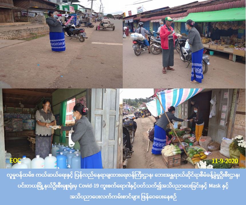 လူမှုဝန်ထမ်း၊ ကယ်ဆယ်ရေးနှင့် ပြန်လည်နေရာချထားရေးဝန်ကြီးဌာန၊ ဘေးအန္တရာယ်ဆိုင်ရာစီမံခန့်ခွဲမှုဦးစီးဌာန၊ ပင်းတယမြို့နယ်ဦးစီးမှူးရုံးမှ တာဝန်ရှိသူများသည် (၁၁-၉-၂၀၂၀) ရက်နေ့တွင် ပင်းတယမြို့ ဈေးတန်းရပ်ကွက်နှင့် ရှမ်းရပ်ရပ်ကွက်အတွင်းတွင် covid-19 ဒုတိယလှိုင်းကာလအတွင်း ပြည်တွင်းကူးစက်ပြန့်ပွားမှု ကြိုတင်ကာကွယ်ရေး အသိပညာပေးခြင်း၊ သဘာဝဘေးအန္တရာယ်များဆိုင်ရာ အသိပညာပေးခြင်းတို့ကို Hand Speaker များဖြင့် လှည့်လည်ဟောပြောခြင်း၊ Mask နှင့် အသိပညာပေးလက်ကမ်းစာစောင်များ ဖြန့်ဝေခြင်းများဆောင်ရွက်ခဲ့ပါကြောင်း သတင်းရရှိပါသည်။