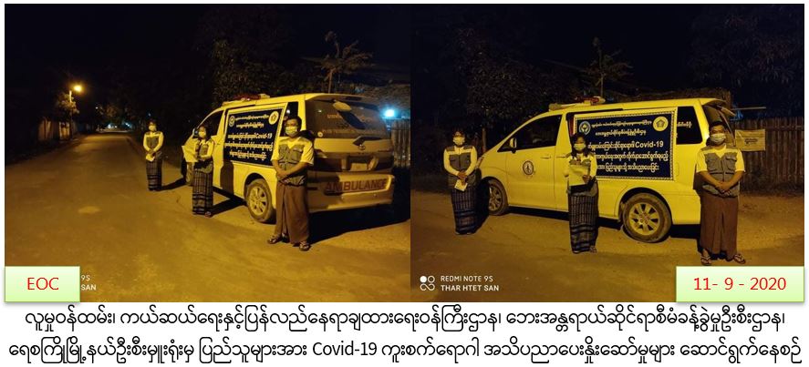 လူမှုဝန်ထမ်း၊ ကယ်ဆယ်ရေးနှင့်ပြန်လည်နေရာချထားရေးဝန်ကြီးဌာန၊ ဘေးအန္တရာယ်ဆိုင်ရာစီမံခန့်ခွဲမှုဦးစီးဌာန၊ ရေစကြို မြို့နယ်ဦးစီးမှူးရုံးမှ တာဝန်ရှိသူများသည် (၁၁.၉.၂၀၂၀) ရက်နေ့တွင် (၁၉:၀၀)နာရီမှ စတင်၍ (၂၂:၀၀)အချိန်ထိ ရေစကြိုမြို့ပေါ်ရှိ အမှတ်(၁)ရပ်ကွက်၊ အမှတ်(၂)ရပ်ကွက်၊ အမှတ်(၃) ရပ်ကွက်နှင့် အမှတ်( ၄) ရပ်ကွက်များသို့ COVID-19ရောဂါ ကူးစက်ပျံ့နှံ့မှုများ မဖြစ်ပွားစေရန်အတွက် သိရှိလိုက်နာဆောင်ရွက်ရန်များကို လော်စပီကာဖြင့် အသိပညာပေး ဆောင်ရွက်ခဲ့ပါကြောင်း သတင်းရရှိပါသည်။