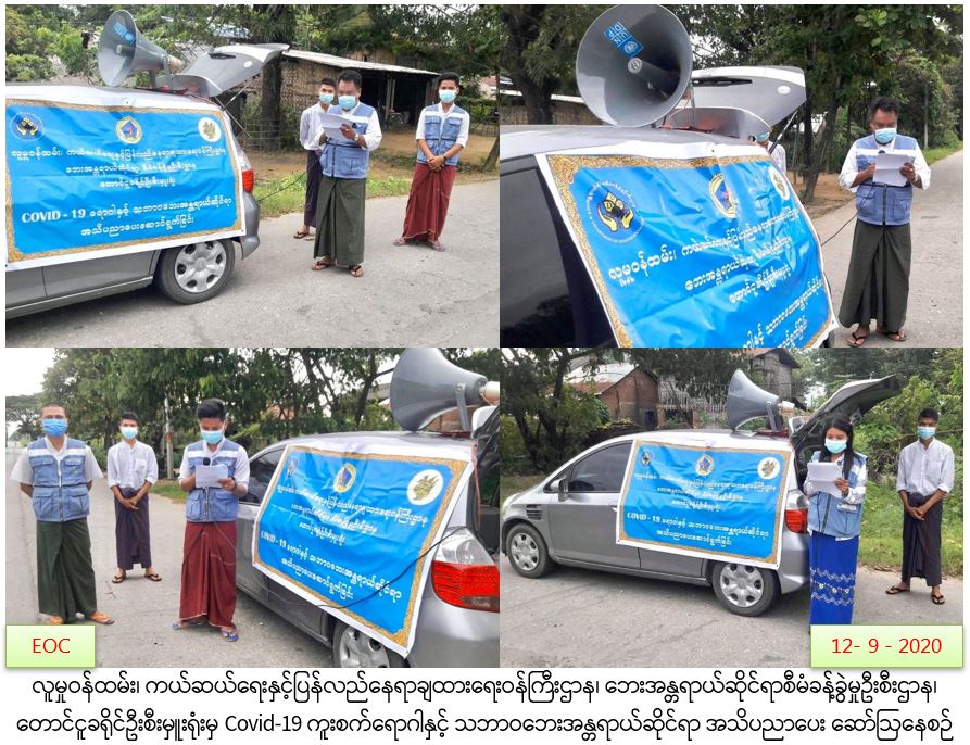 လူမှုဝန်ထမ်း၊ ကယ်ဆယ်ရေးနှင့်ပြန်လည်နေရာချထားရေးဝန်ကြီးဌာန၊ ဘေးအန္တရာယ်ဆိုင်ရာစီမံခန့်ခွဲမှုဦးစီးဌာန၊ ပဲခူးတိုင်းဒေသကြီး၊ တောင်ငူခရိုင်ဦးစီးမှူးရုံးမှ ဝန်ထမ်းများသည် ဖြူးမြို့နယ်၊ သမန်းခင်ကျေးရွာ၊ ရေအိုးစဉ်ကျေးရွာ၊ ဒေါမကွင်းကျေးရွာ၊ ဆိုးပုံကွင်းကျေးရွာ၊ ကွင်းဝိုင်းကျေးရွာနှင့် အင်တောကန် ကျေးရွာများတွင် (၁၂-၉-၂၀၂၀) ရက်နေ့၌ COVID-19 ရောဂါ ကူးစက်ပြန့်ပွားမှု မဖြစ်စေရေးနှင့် မိုးရာသီကာလအတွင်း ဖြစ်ပွားတတ်သည့် သဘာဝဘေးအန္တရာယ်များနှင့်ပတ်သက်၍ ဆောင်ရန်၊ ရှောင်ရန်အချက်များအား အသိပညာပေး ဆော်ဩခဲ့ကြောင်းသတင်းရရှိပါသည်။