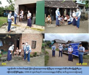 လူမှုဝန်ထမ်း၊ ကယ်ဆယ်ရေးနှင့်ပြန်လည်နေရာချထားရေးဝန်ကြီးဌာန၊ ဘေးအန္တရာယ်ဆိုင်ရာစီမံခန့်ခွဲမှုဦးစီးဌာန၊ ကျိုင်းတုံခရိုင်ဦးစီးမှူးရုံးမှ တာဝန်ရှိသူများသည် (၁၂.၉.၂၀၂၀)ရက်နေ့တွင် ကျိုင်းတုံခရိုင်လူမှုဝန်ထမ်းဦးစီးဌာနနှင့် ပူးပေါင်း၍ ကျိုင်းတုံမြို့နယ်၊ မိုင်းခွန်ကျေးရွာအုပ်စု၊ မိုင်းခွန်ကျေးရွာ၊ နောင်ဖာလာကျေးရွာ၊ ဟွေယုတ်(၁)ကျေးရွာ၊ ဟွေယုတ်(၂) ကျေးရွာ၊ ဝမ်အွယ်ကျေးရွာ ၊ နောင်လျန်ကျေးရွာတို့၌ Covid-19 ဒုတိယလှိုင်းကာလအတွင်း ပြည်သူများ လိုက်နာရမည့် ကျန်းမာရေးအမူအကျင့်များ အသိပညာပေးခြင်းနှင့် သဘာဝဘေးဆိုင်ရာအသိပညာပေးခြင်းများကို Hand Speaker အသံချဲ့စက်များဖြင့် လှည့်လည်ဟောပြောခြင်း ၊ Mask နှင့် အသိပညာပေးလက်ကမ်း စာစောင်များ ဖြန့်ပေးဝေခြင်းတို့အား ဆောင်ရွက်ခဲ့ပါကြောင်း သတင်းရရှိပါသည်။