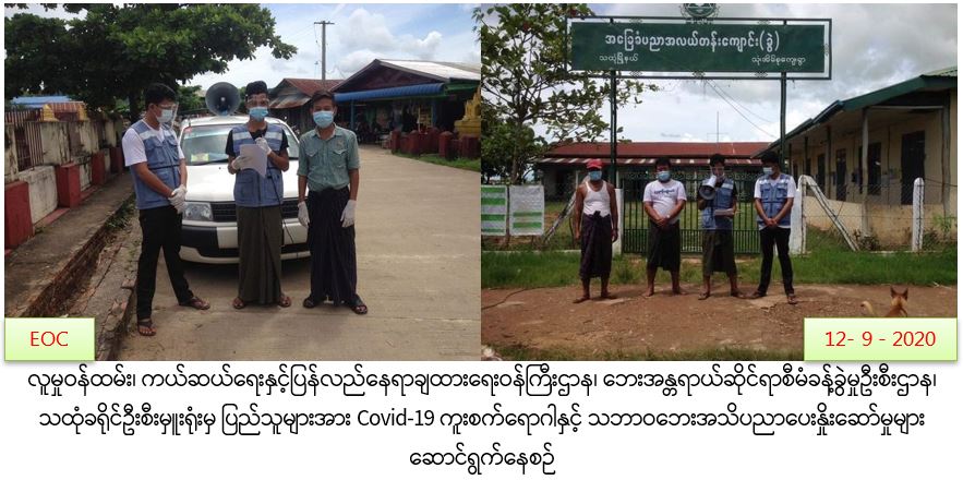 လူမှုဝန်ထမ်း၊ ကယ်ဆယ်ရေးနှင့်ပြန်လည်နေရာချထားရေးဝန်ကြီးဌာန၊ ဘေးအန္တရာယ်ဆိုင်ရာစီမံခန့်ခွဲမှုဉီးစီးဌာန၊ သထုံခရိုင်ဦးစီးမှူးရုံးမှ တာဝန်ရှိသူများသည် (၁၂-၉-၂၀၂၀) ရက်နေ့၊(၁၀:၀၀)နာရီအချိန်မှ (၁၆:၀၀) နာရီအချိန်ထိ မွန်ပြည်နယ်၊ သထုံခရိုင်၊ သထုံမြို့နယ်၊ အုပ္ဖိုလ် ချောင်ကျေးရွာနှင့် သုံးအိမ်စုကျေးရွာတို့တွင် Covid-19 ရောဂါကူးစက်ပျံ့နှံ့မှုများမဖြစ်ပွားစေရေးနှင့် မိုးရာသီကာလအတွင်းဖြစ်ပွားလေ့ရှိသည့် မိုးကြိုးဘေး၊ မုန်တိုင်းဘေး၊ ရေဘေး၊ မြေပြိုဘေးအန္တရာယ်များ ကြိုတင်ပြင်ဆင်ရေး အသိပညာပေးဟောပြောခြင်းအား အသံချဲ့စက်များဖြင့်လည်းကောင်း၊ ရေဘေးအန္တရာယ် ကြိုတင်ကာကွယ်ရေးအသိပေးနှိုးဆော်ခြင်းအား Handspeaker များဖြင့်လည်းကောင်း အသိပညာပေးဆော်ဩခြင်းများ ဆောင်ရွက်ခဲ့ကြောင်း သတင်းရရှိပါသည်။