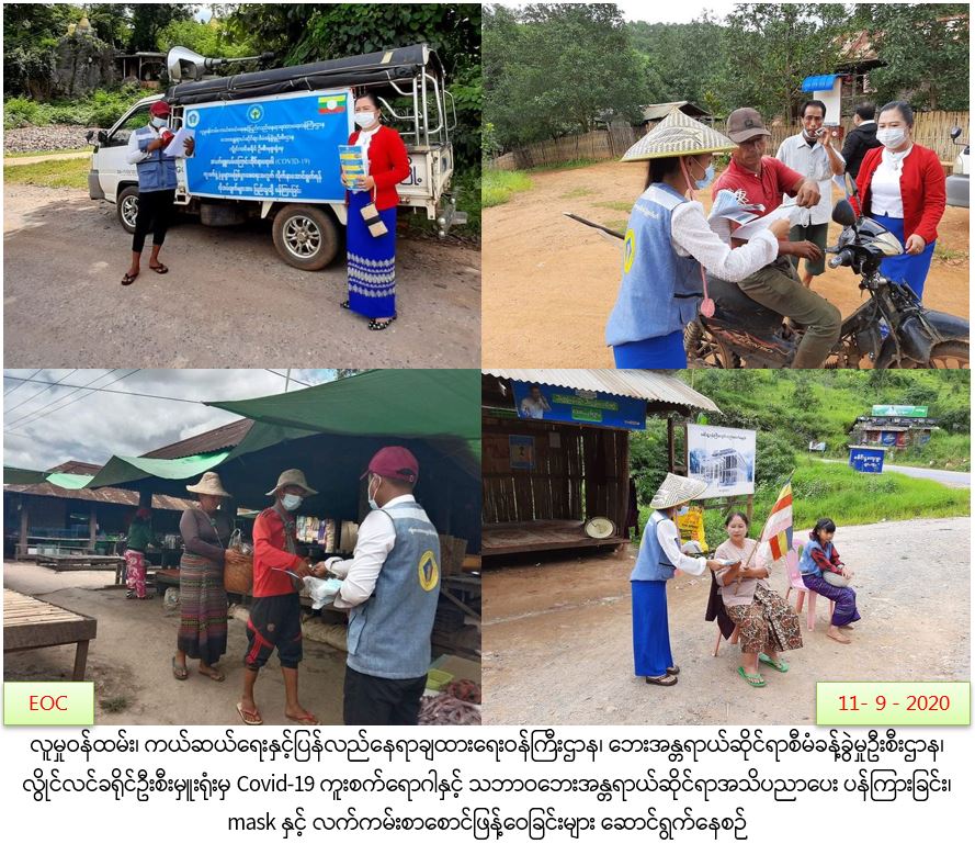 လူမှုဝန်ထမ်း၊ ကယ်ဆယ်ရေးနှင့်ပြန်လည်နေရာချထားရေးဝန်ကြီးဌာန၊ ဘေးအန္တရာယ်ဆိုင်ရာစီမံခန့်ခွဲမှုဦးစီးဌာန၊ လွိုင်လင်ခရိုင်ဦးစီးမှူးရုံးမှ တာဝန်ရှိသူများသည် လွိုင်လင် covid-19ရောဂါ ကာကွယ်ရန် အကူအညီပေးရေးအဖွဲ့၊ မေတ္တာလွမ်းခြုံလွှာ လူမူကူညီရေးအဖွဲ့ တို့နှင့်ပူးပေါင်း၍ Covid-19 ကူးစက်ရောဂါ ဒုတိယလှိုင်းကာလအတွင်း ပြည်တွင်းကူးစက်ပျံ့ပွားမှု ကြိုတင်ကာကွယ်ရေးအတွက် (၁၁.၉.၂၀၂၀)ရက်နေ့၊ နံနက်(၉းဝဝ) နာရီမှနေ့လည်(၁၂းဝဝ)ထိ လွိုင်လင်မြို့၊ ဟိုတင့်ကျေးရွာ၊ ခေါင်းနွဲ့ကျေးရွာ ၊တောင်နောက် ကျေးရွာတို့၌ လည်းကောင်း၊ မွန်းလွဲပိုင်း(၁၃း၁၅)မှ(၁၅းဝ၀)ထိ လွိုင်လင်ခရိုင်မိုင်းပွန်မြို့ ၌လည်းကောင်း Covid-19 ကူးစက်ရောဂါကြိုတင်ကာကွယ်ရေး အသိပညာပေးခြင်း၊ ၊သဘာဝဘေးအန္တရာယ်အကြောင်းများနှင့် ရှောင်ရန်/ဆောင်ရန် စသည်များအား ပအိုဘာသာ၊ ရှမ်းဘာသာ၊ မြန်မာဘာသာဖြင့်လှည့်လည်ဆော်သြပြီး ပါးစပ်နှင့် နှာခေါင်းစည်း(mask)များဖြန့်ဝေခြင်း၊ Covid-19 အသိပညာပေး လက်ကမ်းစာစောင်များဖြန့်ဝေခြင်း၊ သဘာဝဘေးအန္တရာယ်ဆိုင်ရာရှောင်ရန်/ဆောင်ရန် လက်ကမ်းစာစောင်များဖြန့်ဝေခြင်း ပိုစတာများကပ်ခြင်း/ ဖြန့်ဝေခြင်း ဗွီနှိုင်းပိုစတာကပ်ခြင်းများ ဆောင်ရွက်ခဲ့ကြောင်း သတင်းရရှိပါသည်။