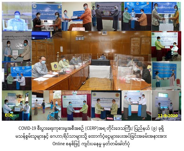 COVID-19 စီးပွားရေးကုစားမှုအစီအစဉ် (CERP)အရ တိုင်းဒေသကြီး/ ပြည်နယ် (၉) ခုရှိ မသန်စွမ်းသူများနှင့် ဂေဟာ/ရိပ်သာများသို့ ထောက်ပံ့ငွေများပေးအပ်ခြင်းကို ယနေ့နံနက်ပိုင်းက အဆိုပါဝန်ကြီးရုံးအစည်းအဝေးခန်းမ၌ Online စနစ်ဖြင့်ကျင်းပရာ လူမှုဝန်ထမ်း၊ ကယ်ဆယ်ရေးနှင့် ပြန်လည်နေရာချထားရေးဝန်ကြီးဌာန၊ ဒုတိယဝန်ကြီးဦးစိုးအောင် တက်ရောက်၍ အမှာစကား ပြောကြားခဲ့သည်။