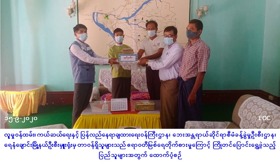 လူမှုဝန်ထမ်း၊ ကယ်ဆယ်ရေးနှင့် ပြန်လည်နေရာချထားရေးဝန်ကြီးဌာန၊ ဘေးအန္တရာယ်ဆိုင်ရာစီမံခန့်ခွဲမှုဦးစီးဌာန၊ ရေနံချောင်းမြို့နယ်ဦးစီးမှူးရုံးမှ တာဝန်ရှိသူများသည် မကွေးတိုင်းဒေသကြီး၊ ရေနံချောင်းမြို့နယ်၊ ကျမ်းကိုင်ကျွန်းကျေးရွာအုပ်စု ကံသာကျေးရွာ၌ ဧရာဝတီမြစ်ရေတိုက်စားမှုကြောင့် (၁၄-၉-၂၀၂၀) ရက်နေ့တွင် ကြိုတင်ပြောင်းရွှေ့ခဲ့သည့် နေအိမ်(၄)လုံးအတွက် အိမ်ဆောက်ပစ္စည်းဖိုးငွေ(၄၀၀၀၀၀)ကျပ်၊ လူဦးရေ(၂၂)ဦးအတွက် ဆန်ရိက္ခာ(၇)ရက်စာ(၄၆၂၀၀)ကျပ်၊ စုစုပေါင်းထောက်ပံ့ငွေ(၄၄၆၂၀၀)ကျပ်အား ရေနံချောင်းမြို့နယ်အထွေထွေအုပ်ချုပ်ရေးဦးစီးဌာန ရုံးခန်း၌ အထွေထွေအုပ်ချုပ်ရေးဦးစီးဌာနမှ တာဝန်ရှိသူများနှင့်အတူ ကျေးရွာတာဝန်ရှိသူများထံ (၁၅-၉-၂၀၂၀) ရက်နေ့တွင် ထောက်ပံ့ပေးအပ်ခဲ့ကြောင်း သတင်းရရှိပါသည်။