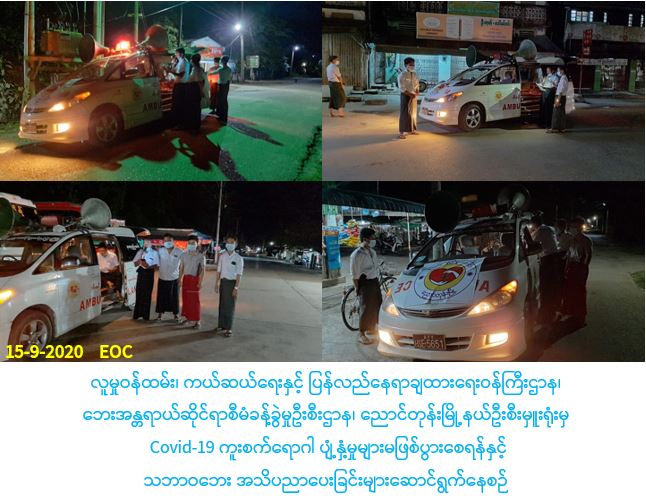 လူမှုဝန်ထမ်း၊ ကယ်ဆယ်ရေးနှင့် ပြန်လည်နေရာချထားရေးဝန်ကြီးဌာန၊ ဘေးအန္တရာယ်ဆိုင်ရာစီမံခန့်ခွဲမှုဦးစီးဌာန၊ ညောင်တုန်းမြို့နယ်ဦးစီးမှူးရုံးမှ တာဝန်ရှိသူများသည် ပြန်ကြားရေးနှင့်ပြည်သူ့ဆက်ဆံရေးဦးစီးဌာန၊ နာရေးကူညီမှုအသင်း (ညောင်တုန်း) တို့နှင့်ပူးပေါင်း၍ (၁၅-၉-၂၀၂၀) ရက်နေ့ ည (၁၉:၀၀) နာရီတွင် ညောင်တုန်းမြို့၊ ရပ်ကွက် (၁၀) ခုအတွင်း လမ်းဆုံနေရာများနှင့် လူစည်ကားရာနေရာများ၌ Covid -19 ရောဂါ ကြိုတင်ကာကွယ်ရေးအတွက် ကျန်းမာရေးနှင့် အားကစားဝန်ကြီးဌာနမှ ထုတ်ပြန်ထားသော ရောဂါ ကြိုတင်ကာကွယ် ထိန်းချုပ်ရေးညွှန်ကြားချက်များ၊ တိုင်းဒေသကြီးအတွင်း မြို့နယ်ကျော်ခရီးသွားလာပါက ခရီးသွားထောက်ခံချက်ပါရှိစေရေး၊ မိမိနေထိုင်ရာ မြို့နယ်အတွင်း၌သာ ခရီးသွားလာမည် ဆိုပါက ခရီးသွားထောက်ခံချက် ရယူရန်မလိုကြောင်း၊ ယခုအချိန်တွင် စစ်ဆေးရေးဂိတ်များထားရှိပြီး စစ်ဆေးကြပ် မတ်နေသည့် အချိန်အခါဖြစ်သဖြင့် မြို့နယ်တွင်းသွားလာရာတွင် ခရီးသွားထောက်ခံချက် ရယူရန်မလိုအပ်သော်လည်း စစ်ဆေးရေးဂိတ် များတွင် မှတ်ပုံတင်ပြ၍ စစ်ဆေးမှုခံယူပြီးမှသာ သွားလာရမည်ဖြစ်ကြောင်းနှင့် စက်တင်ဘာလ (၁၅)ရက်နေ့မှ အောက်တိုဘာ လ (၁) ရက်နေ့အထိ ဧရာဝတီတိုင်းဒေသကြီးအတွင်း မြို့နယ်များရှိ စားသောက်ဆိုင်များနှင့် လက်ဖက်ရည်ဆိုင်များအား နံနက် (၆)နာရီမှ ည (၈)နာရီ အတွင်း၌သာ ဖွင့်လှစ်ရောင်းချခွင့်ပြုသွားမည်ဖြစ်ကြောင်း၊ထိုသို့ရောင်းချရာတွင်လည်း ဆိုင်တွင်ထိုင်၍ စားသောက်နိုင်သည့် ရောင်းချသည့်စနစ်အစား အစားအသောက်များအား အထုပ်ဖြင့် ဝယ်ယူသွားနိုင်သော ပါဆယ်စနစ် (Take Away System) ဖြင့် ဆောင်ရွက်သွားရန် စသည့် လိုက်နာဆောင်ရွက်ရမည့်အချက်များအား အများပြည်သူများ သိရှိနိုင်စေရန် လှည့်လည်ကြေညာပေးခဲ့ပါကြောင်း သတင်းရရှိပါသည်။