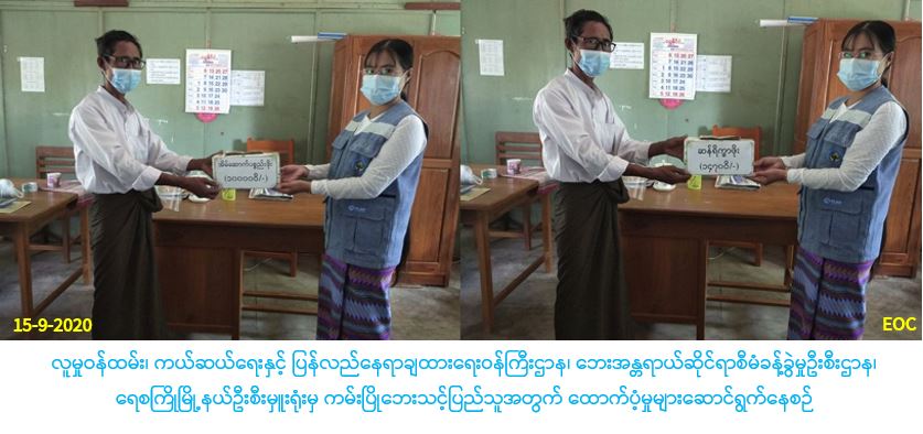 လူမှုဝန်ထမ်း၊ ကယ်ဆယ်ရေးနှင့် ပြန်လည်နေရာချထားရေးဝန်ကြီးဌာန၊ ဘေးအန္တရာယ်ဆိုင်ရာစီမံခန့်ခွဲမှုဦးစီးဌာန၊ ရေစကြိုမြို့နယ်ဦးစီးမှူးရုံးမှ တာဝန်ရှိသူများသည် (၁၅-၉-၂၀၂၀) ရက်နေ့၊ (၀၉:၃၀) အချိန်၌ ရေစကြိုမြို့နယ်၊ ငါးလန်ကျေးရွာ အုပ်စု၊ ငါးလန်ကျေးရွာတွင် ဧရာဝတီမြစ်ရေတိုက်စားကမ်းပါးပြိုကျမှုကြောင့် ကြိုတင်ဖျက်သိမ်းပြောင်းရွှေ့ခြင်းများ ဆောင်ရွက်ခဲ့ကြရာ ကြိုတင်ဖျက်သိမ်းပြောင်းရွှေ့လူနေအိမ်(၁)လုံး၊ အိမ်ထောင်စု(၁)စု၊ လူဦးရေ(၇)ဦးတို့အတွက် အိမ်ဆောက် ပစ္စည်းဖိုးထောက်ပံ့ငွေ(၁၀၀၀၀၀/-)ကျပ်၊ ဆန်ရိက္ခာဖိုးထောက်ပံ့ငွေ(၁၄၇၀၀/-)ကျပ်၊ စုစုပေါင်းထောက်ပံ့ငွေ (၁၁၄၇၀၀/-)ကျပ် အား (၁၅-၉-၂၀၂၀) ရက်နေ့၊ (၁၅:၀၀) အချိန်တွင် ကျေးရွာအုပ်ချုပ်ရေးမှူးလက်ဝယ်အရောက် ထောက်ပံ့ပေးအပ်ခဲ့ပါကြောင်း သတင်းရရှိပါသည်။