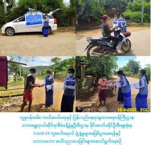 လူမှုဝန်ထမ်း၊ ကယ်ဆယ်ရေးနှင့် ပြန်လည်နေရာချထားရေးဝန်ကြီးဌာန၊ ဘေးအန္တရာယ်ဆိုင်ရာစီမံခန့်ခွဲမှုဦးစီးဌာန၊ မိုင်းဆတ်ခရိုင်ဦးစီးမှူးရုံးမှ တာဝန်ရှိသူများသည် (၁၆-၉-၂၀၂၀) ရက်နေ့ မိုင်းဆတ်မြို့နယ်၊ တောင်လှေကားကျေးရွာနှင့် ချောင်းဆုံကျေးရွာတို့၌ Covid-19 ကူးစက်ရောဂါ ပျံ့နှံ့မှုများမဖြစ်ပွားစေရန် ပြည်သူများ လိုက်နာရမည့် ကျန်းမာ ရေးအမူအကျင့်များ အသိပညာပေးခြင်းနှင့် သဘာဝဘေးဆိုင်ရာ အသိပညာပေးခြင်းများကို Hand Speaker အသံချဲ့စက်များဖြင့် လှည့်လည်ဟောပြောခြင်း ၊ Mask နှင့် အသိပညာပေးလက်ကမ်းစာစောင်များ ဖြန့်ဝေပေးခြင်းတို့အား ဆောင်ရွက်ခဲ့ပါကြောင်း သတင်းရရှိပါသည်။