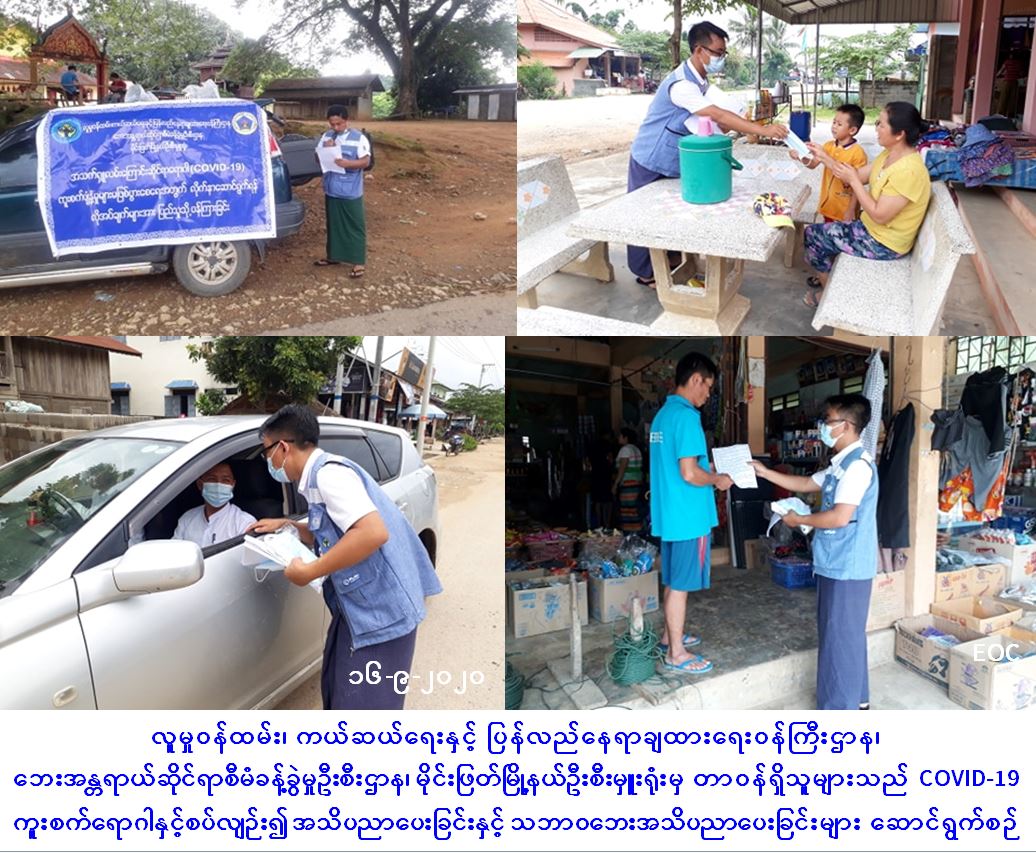 လူမှုဝန်ထမ်း၊ ကယ်ဆယ်ရေးနှင့် ပြန်လည်နေရာချထားရေးဝန်ကြီးဌာန၊ ဘေးအန္တရာယ်ဆိုင်ရာစီမံခန့်ခွဲမှုဦးစီးဌာန၊ မိုင်းဖြတ်မြို့နယ်ဦးစီးမှူးရုံးမှ တာဝန်ရှိသူများသည် (၁၆-၉-၂၀၂၀) ရက်နေ့၊ (၁၀:၃၀) နာရီအချိန်မှစတင်ကာ မိုင်းဖြတ်မြို့နယ်၊ တာမကျေးရွာနှင့့် ပါဆန်းကျေးရွာများအတွင်း Covid-19 ကူးစက်ရောဂါ ပြန့်ပွားမှုများ မဖြစ်ပေါ်စေရန် ကျေးရွာနေပြည်သူများအား Covid-19 ကူးစက်ရောဂါနှင့်စပ်လျဉ်းသည့် ကျန်းမားရေးအမူအကျင့်များ၊ လိုက်နာဆောင်ရွက်ရမည့် စည်းကမ်းချက်များနှင့် သဘာဝဘေးအန္တရာယ်ဆိုင်ရာ အသိပညာပေးခြင်းများ ဆောင်ရွက်ခဲ့ပြီး Covid-19 အသိပညာပေးလက်ကမ်းစာစောင်များ၊ သဘာဝဘေးအသိပညာပေးလက်ကမ်းစာစောင်များ၊ Mask များနှင့် လက်ဆေးဆပ်ပြာများ ဖြန့်ဝေပေးခြင်းတို့ ဆောင်ရွက်ခဲ့ကြောင်း သတင်းရရှိပါသည်။
