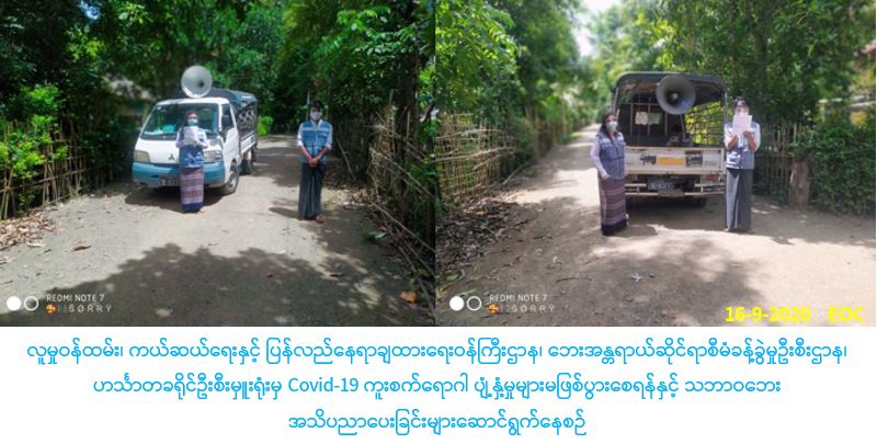 လူမှုဝန်ထမ်း၊ ကယ်ဆယ်ရေးနှင့် ပြန်လည်နေရာချထားရေးဝန်ကြီးဌာန၊ ဘေးအန္တရာယ်ဆိုင်ရာစီမံခန့်ခွဲမှုဦးစီးဌာန၊ ဟင်္သာတခရိုင်ဦးစီးမှူးရုံးမှ တာဝန်ရှိသူများသည် (၁၆-၉-၂၀၂၀) ရက်နေ့ နံနက် (၁၁:၀၀) နာရီအချိန်မှ (၁၃:၃၀) နာရီအချိန်ထိ ကြံခင်းမြို့နယ်၊ ကြာအင်းအုပ်စု၊ (ကြာအင်းလေး၊ သရက်တော၊ ကိုးပင်၊ကံဆယ်) ကျေးရွာတို့တွင် ကျန်းမာရေးနှင့်အားကစား ဝန်ကြီးဌာနမှ ထုတ်ပြန်ထားသော Covid-19 ကူးစက်ရောဂါ ပျံ့နှံ့မှုများမဖြစ်ပွားစေရန် အသိပညာပေးခြင်းလုပ်ငန်းများနှင့် ဧရာဝတီတိုင်းဒေသကြီး Covid -19 ထိန်းချုပ်ရေးနှင့် အရေးပေါ်တုံ့ပြန်ရေးကော်မတီမှ အချိန်နှင့်တပြေးညီထုတ်ပြန်လျှက်ရှိ သည့် တားမြစ်မိန့်နှင့် ညွန်ကြားချက်အားလည်းကောင်း၊ ရာသီအလိုက်ဖြစ်ပွားတတ်သော သဘာဝဘေးများအန္တရာယ်များနှင့် ပတ်သက်သည့် သဘာဝဘေးအသိပညာပေးခြင်းတို့အားလည်းကောင်း၊အများပြည်သူများသိရှိလိုက်နာရန် ကွင်းဆင်းလှည့်လှည် ၍ အသိပညာပေးလုပ်ငန်းများပြုလုပ်ဆောင်ရွက်ခဲ့ပါကြောင်း သတင်းရရှိပါသည်။