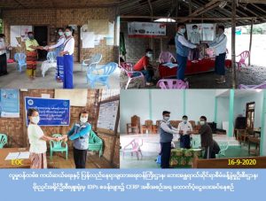 လူမှုဝန်ထမ်း၊ ကယ်ဆယ်ရေးနှင့် ပြန်လည်နေရာချထားရေးဝန်ကြီးဌာန၊ ဘေးအန္တရာယ်ဆိုင်ရာစီမံခန့်ခွဲမှုဦးစီးဌာန၊ မိုးညှင်းခရိုင်ဦးစီးမှူးရုံးမှ တာဝန်ရှိသူများသည် (၁၆-၉-၂၀၂၀) ရက်နေ့တွင် မိုးညှင်းခရိုင်၊ မိုးညှင်းမြို့နယ်ရှိ IDPs စခန်း(၂)ခု၊ မိုးကောင်းမြို့နယ်ရှိ IDPs စခန်း(၃)ခုနှင့် (ယာယီ)စခန်း(၄)ခုတို့မှ စုစုပေါင်းအိမ်ထောင်စု (၃၃၅) စုတို့အတွက် Covid-19 စီးပွားရေးကုစားမှုအစီအစဉ် (CERP) အရ ဒုတိယအကြိမ်စားသောက်ကုန်(၅)မျိုးဝယ်ယူရန် အိမ်ထောင်စု (၁) စုလျှင် (၄၀,၀၀ဝ) ကျပ်နှုန်းဖြင့် စုစုပေါင်းထောက်ပံ့ငွေ (၁၃,၄၀၀,၀၀ဝ) ကျပ်အား စခန်းရှိပြည်သူများလက်ဝယ်အရောက် သွားရောက်ထောက်ပံ့ ပေးအပ်ခဲ့ပါကြောင်း သတင်းရရှိပါသည်။
